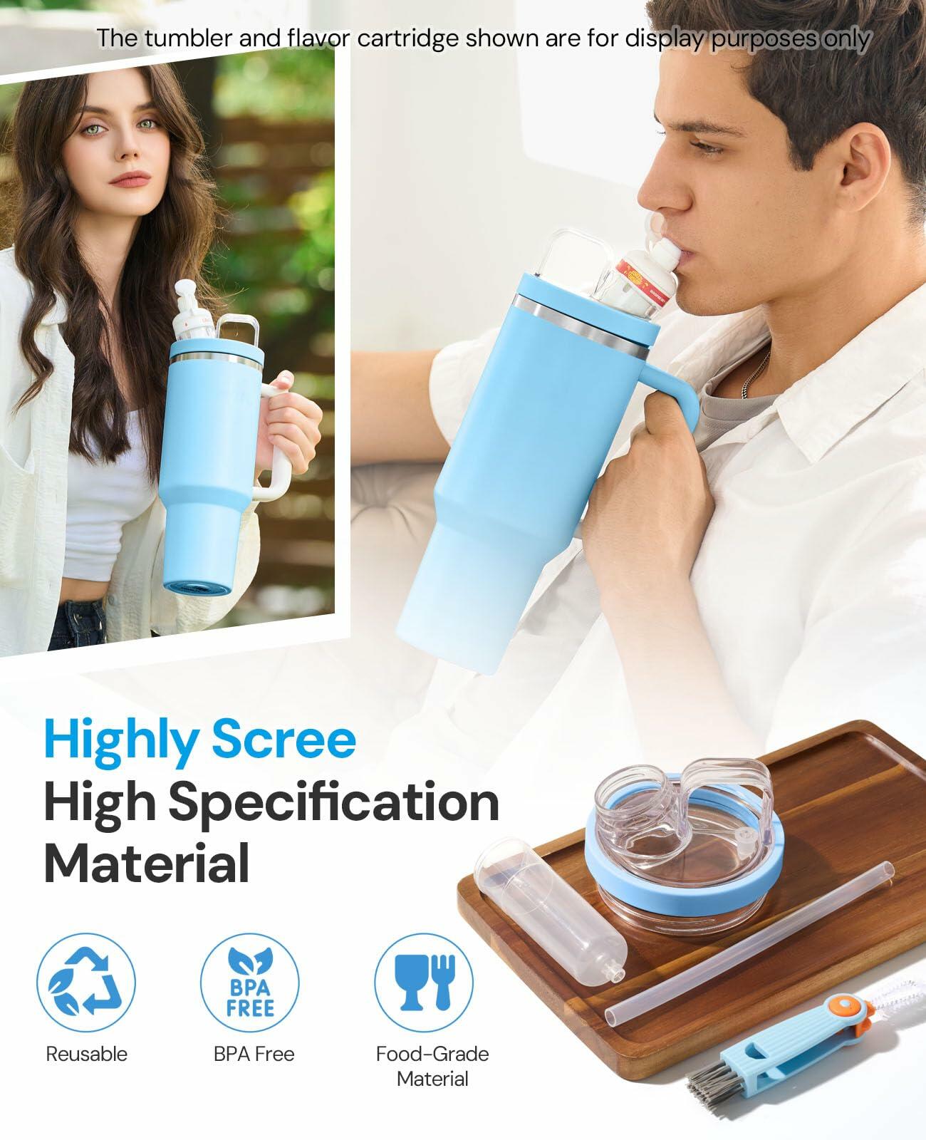 - Easy to Use and Clean - No installation required. Simply attach the adapter to your tumbler, insert the flavor cartridges, and enjoy your customized drink in seconds. Crafted from sturdy polypropylene plastic and paired with a food-safe silicone ring. The product is dishwasher safe