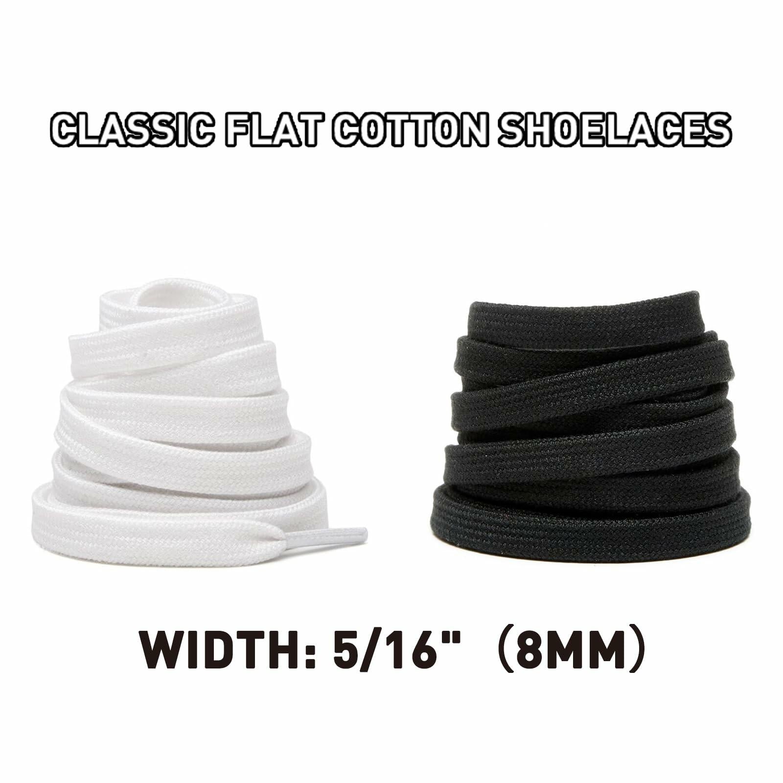 - One Pair: Includes 1 pair (2 laces) solid color cotton shoe strings for sneakers; Width: 8mm(5/16inch); Available in black or white colors and 4 kinds of lengths for young men, women and teens.