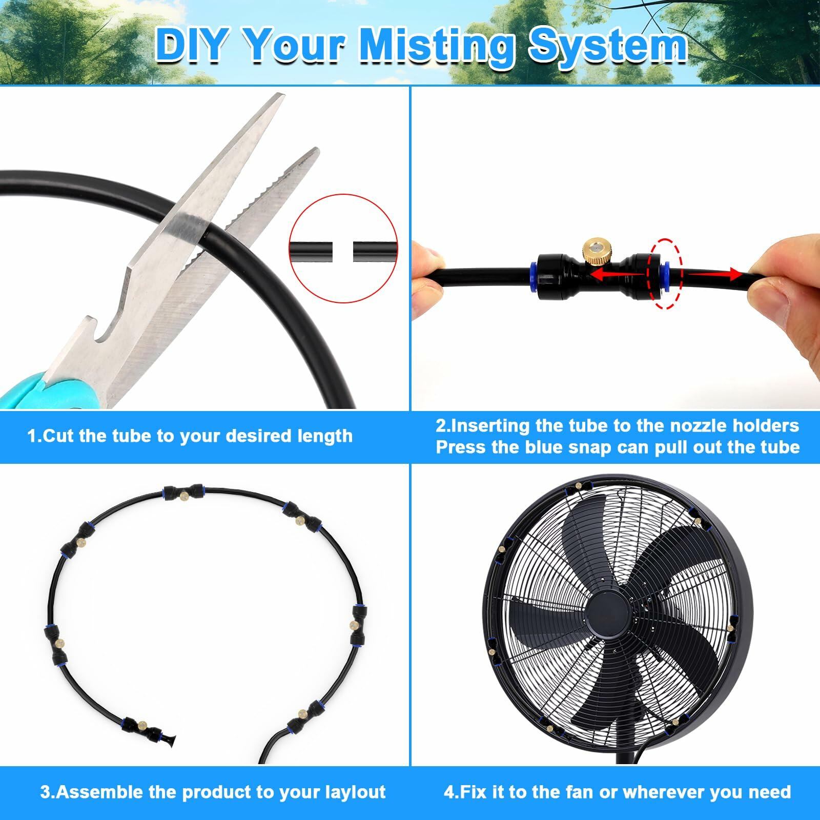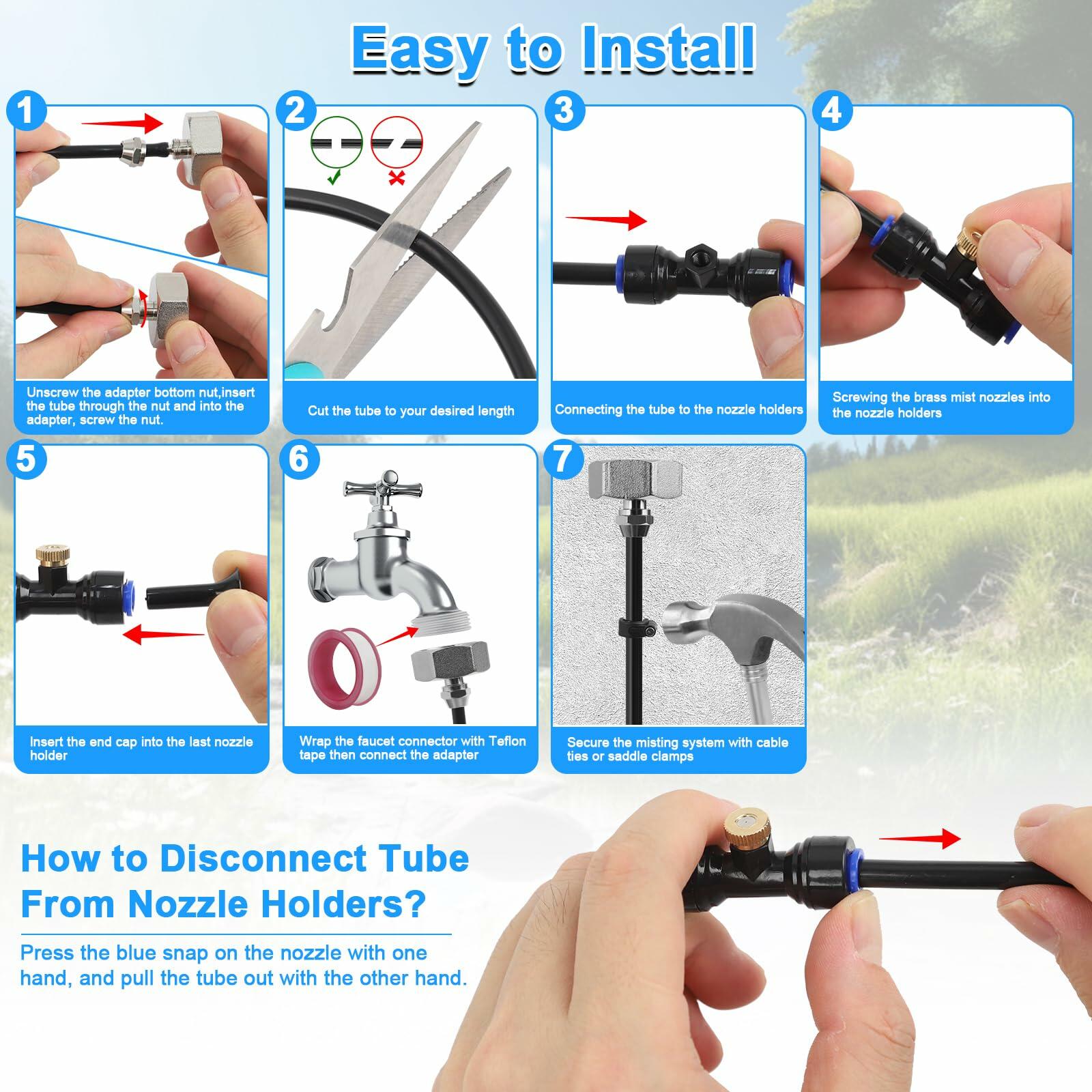 - Easy to Install: No professional assistance is required to install the misting system, as you simply cut the lengh as your desire and plug in the connectors. Our pictures also show detailed installation instructions. To prevent water leakage, please wrap Teflon tape when linking the faucet. (If you have any questions please feel free to contact us)
