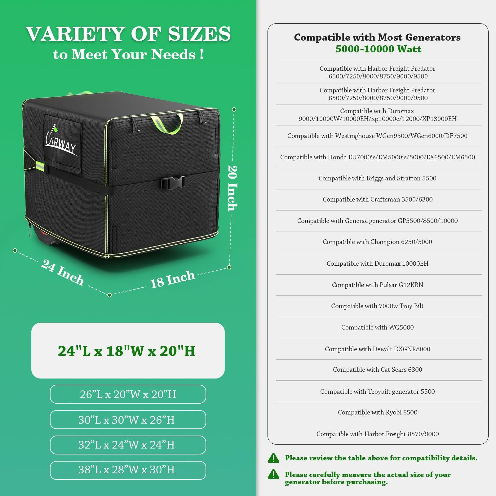 - 『Universal Fit』Outdoor generator cover is designed for 24”L x 18”W x 20”H. Perfectly Fits fo Most Generators 5000-10000 Watt. Warm Tips: Full coverage from top to bottom, recommend to choose the cover 1-2 inch larger than your unit size.
