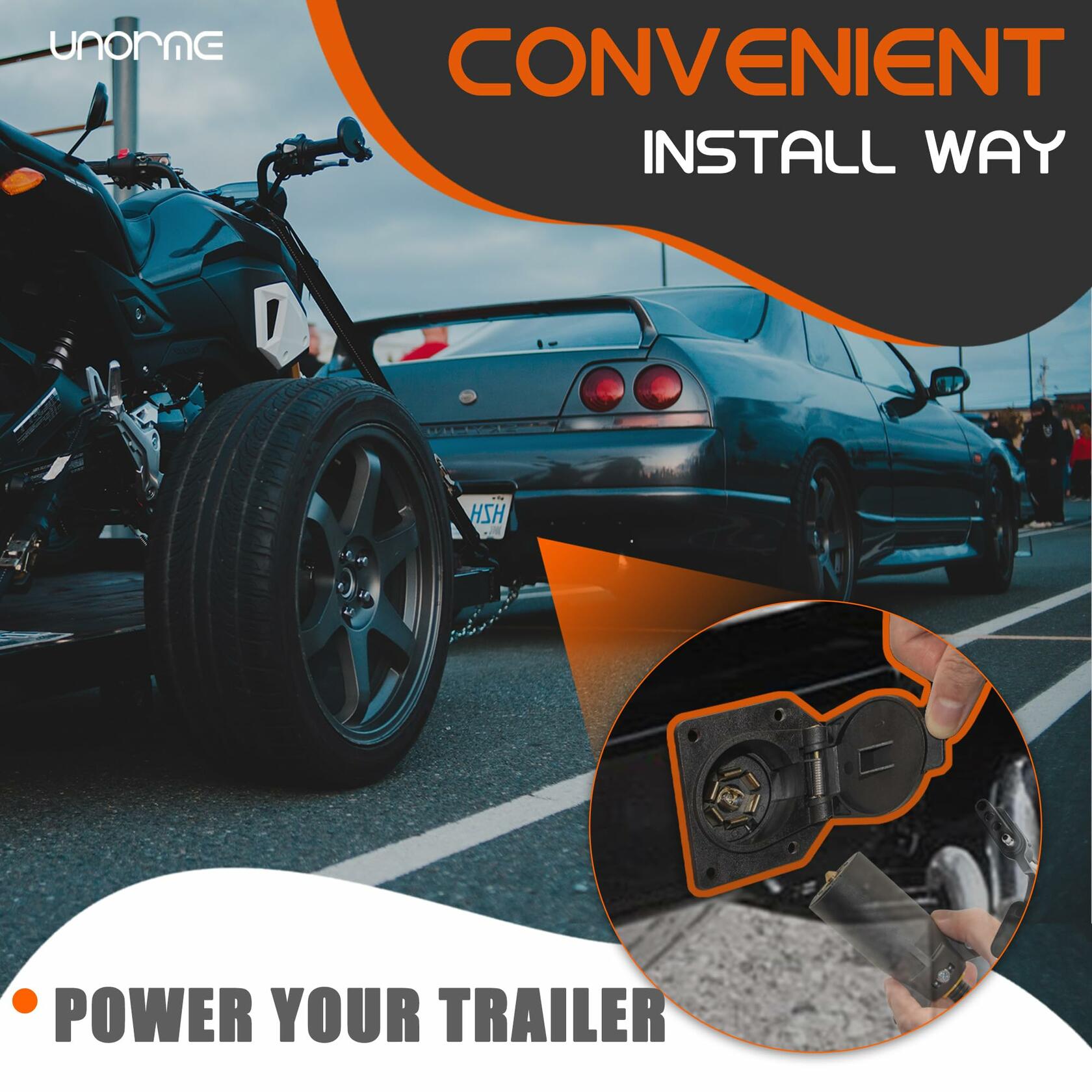 Like trailer hitches and ball mounts, electrical connectors range all over the board in shape, size and capability, but no matter what your trailer's electrical functions are, you need a solid connection to keep the power flowing and ensure safety on the road. UNORME electrical connectors are designed and manufactured to give you a reliable connection every time you plug in your trailer. This 7-way round RV blade connector is designed to supply power for tail lights, turn signals, electric trailer brakes, a 12-volt battery, reverse lights and brake lights, as well as a ground connection. It features rust-free black plastic construction and comes with a spring-loaded cover to keep out dust and water. This 7-way round connector is a female-end socket, specifically designed for the vehicle side of the connection. 7-way RV blades are typically used on RV travel trailers, and this particular connector can be easily interchanges with other 7-way RV connectors.