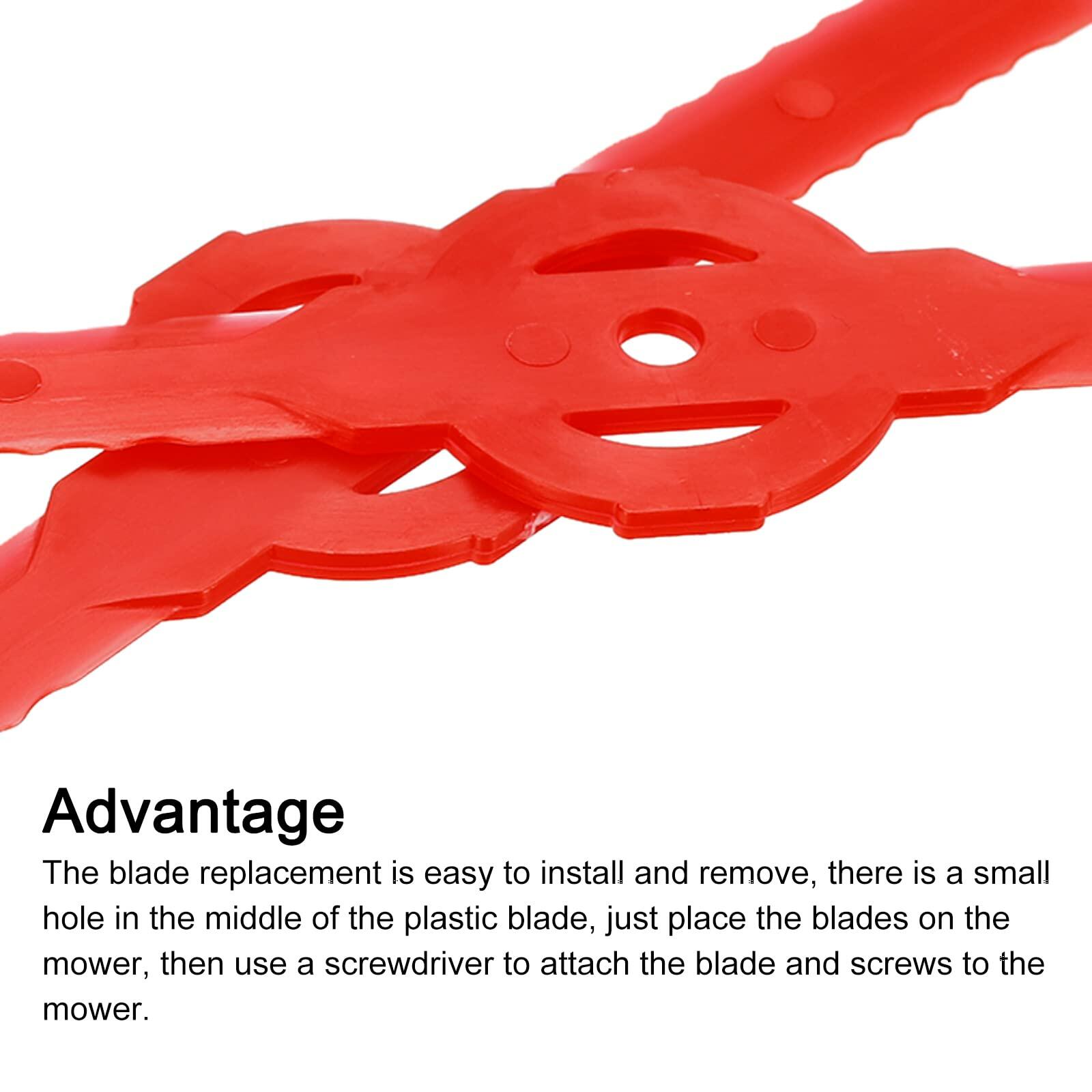 - [Easy to Install] - The blades replacement is easy to install and remove, there is a small hole in the middle of the plastic blade, just place the blades on the mower, then use a screwdriver to attach the blade and screws to the mower. Please confirm the size before purchasing it.