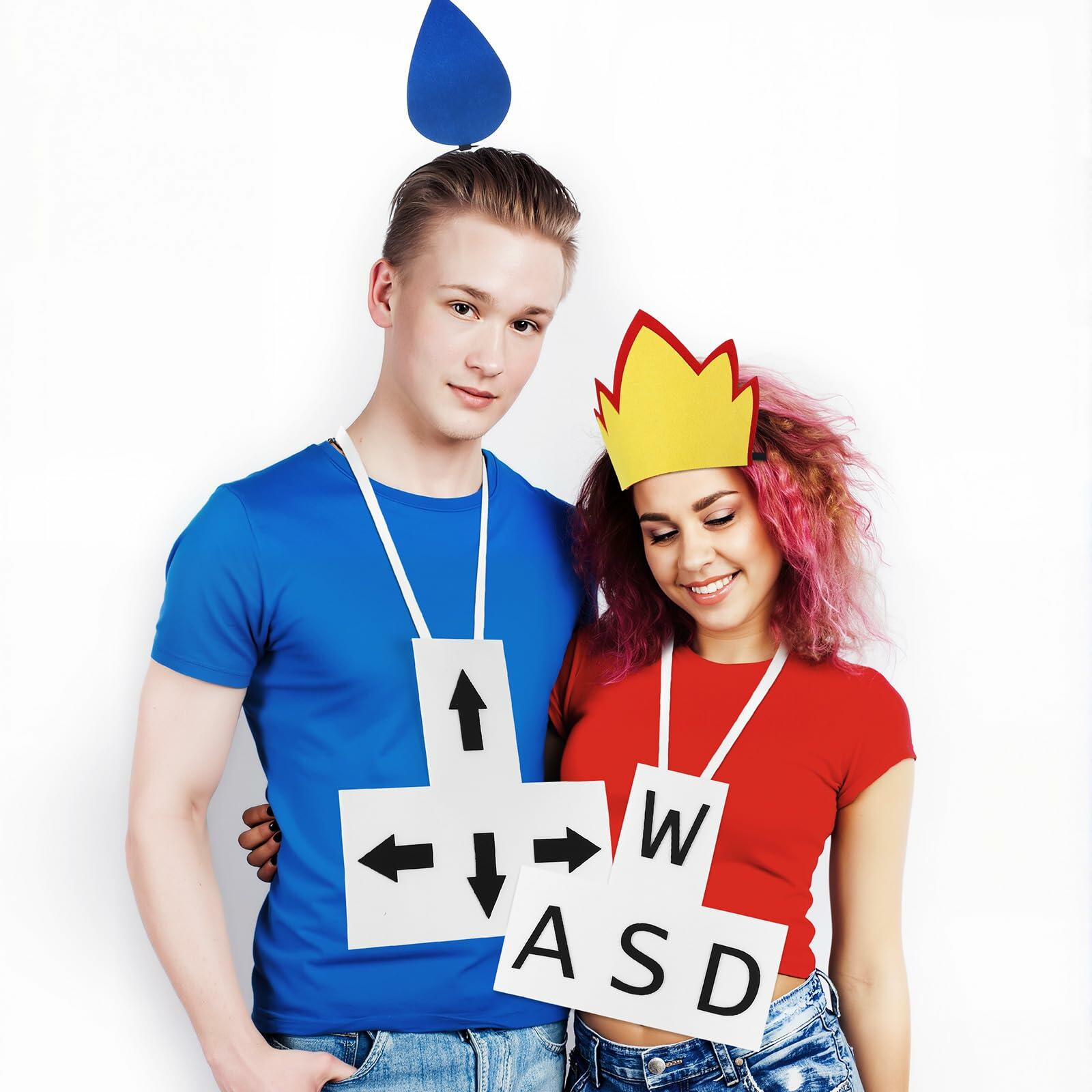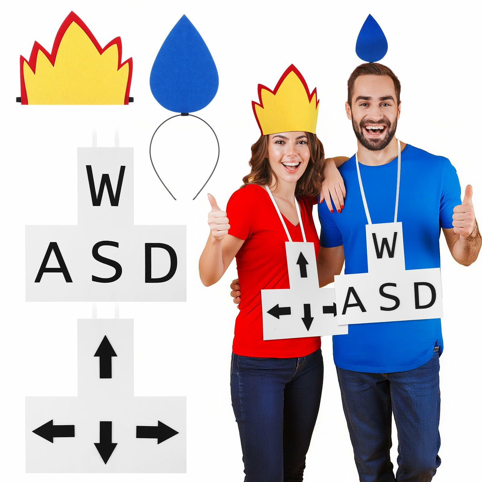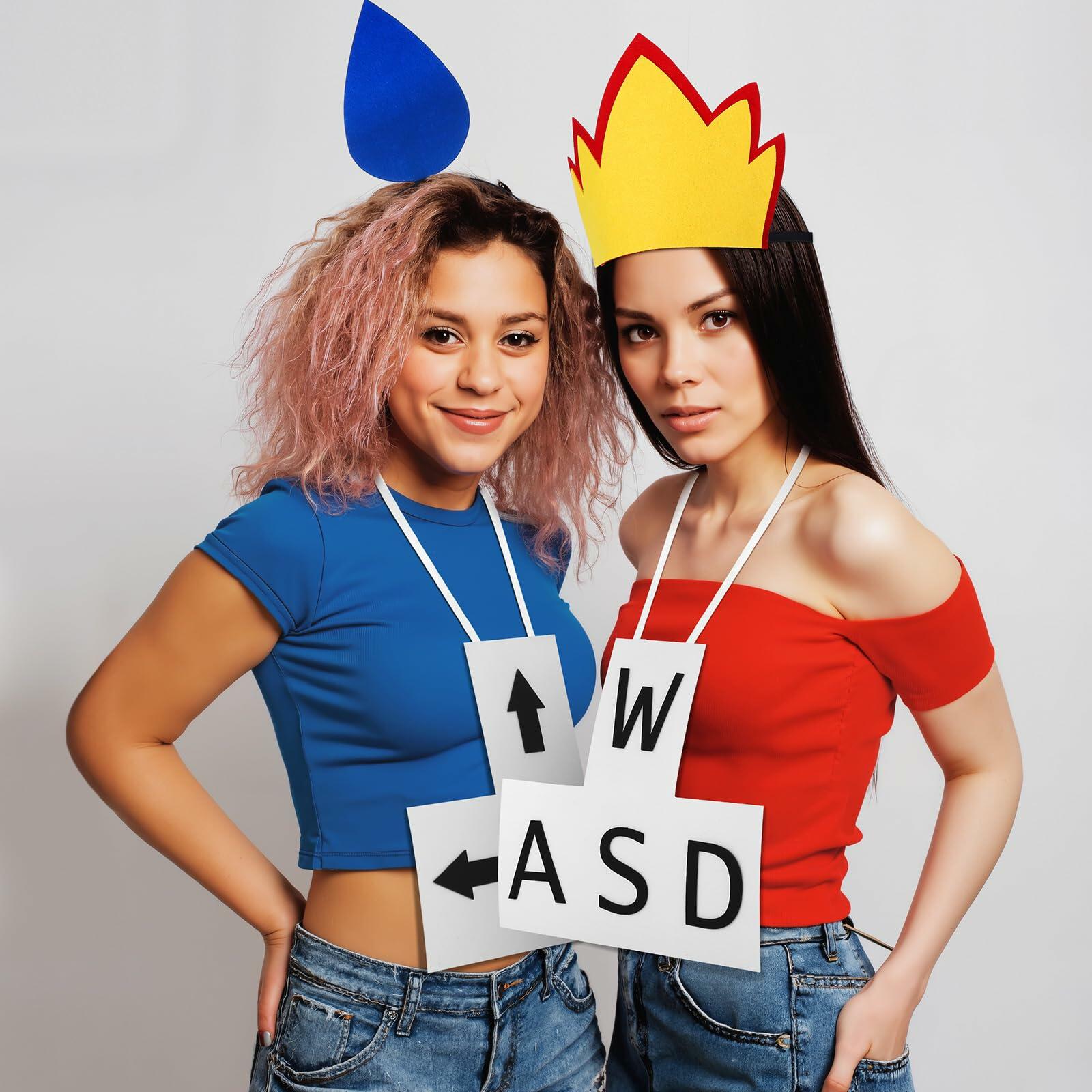 - Complete Set for a Dynamic Costume Ensemble: our package includes a water drop headband, a flame headband, an arrow tag, and a WASD English letter tag; This comprehensive set allows you to share with friends or family, creating a dynamic flame and ice water drop costumes ensemble for group festivities