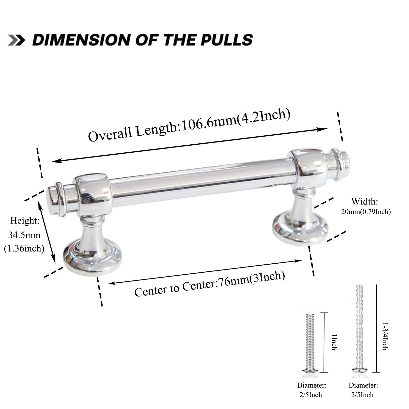 - ⛏️[MEASUREMENT] -This Pulls Hole centers(C-C):3inch (76mm), Total Length:4.2inch(107mm), Height:1.36inch(34.5mm). If you're replacing your handle, measure and ensure the center to center hole spacing of the current handle is 3inch (76mm). Installing new cabinet handles, drill two holes with center to center spacing of 3inch (76mm).