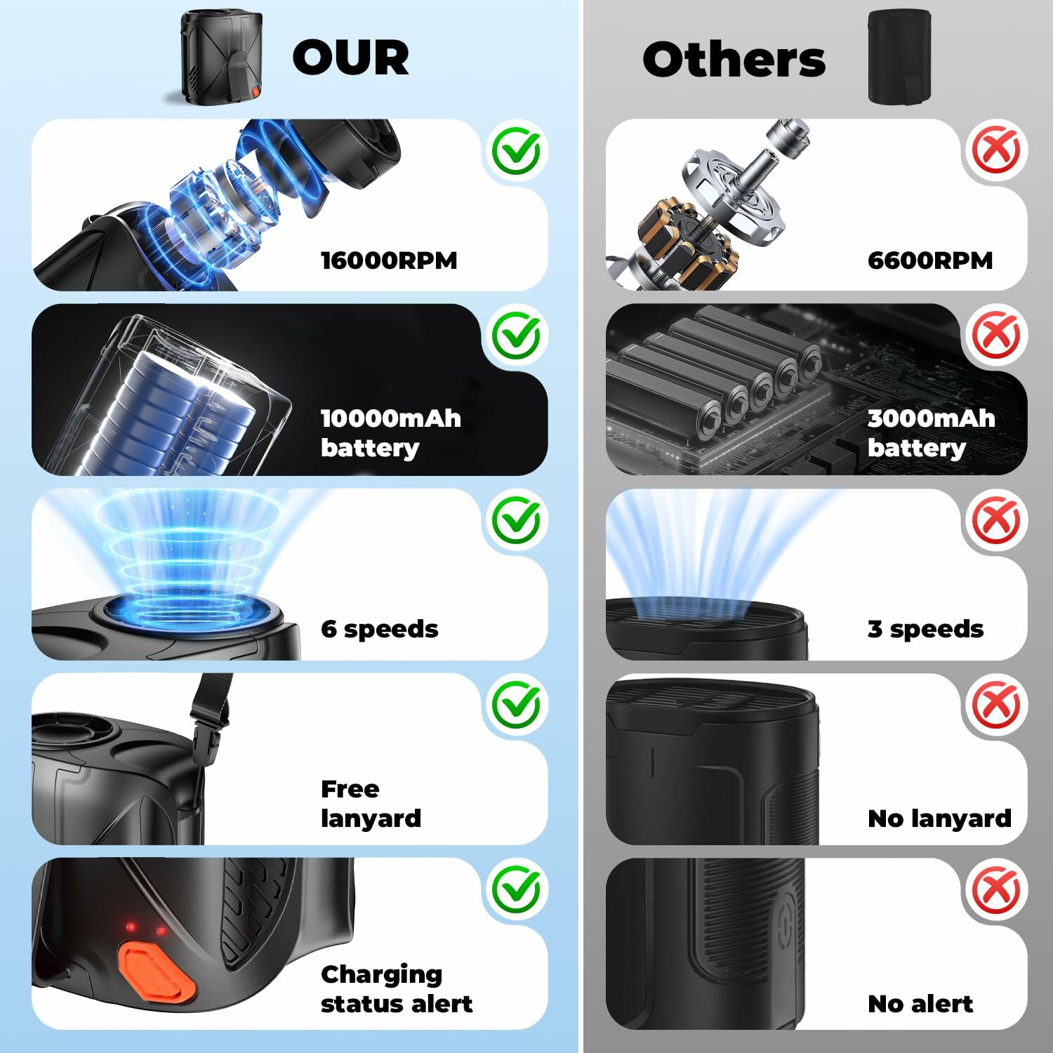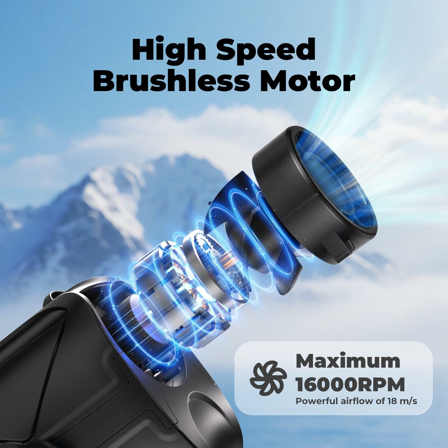 - 【6-Speed Adjustable Turbo Wind】6 speed settings for personalized cooling. The 16,000 RPM brushless motor with 5-blade turbine delivers 30 ft/s powerful airflow - from gentle breeze to intense gust. Provides instant relief during heatwaves, workouts, or crowded commutes.