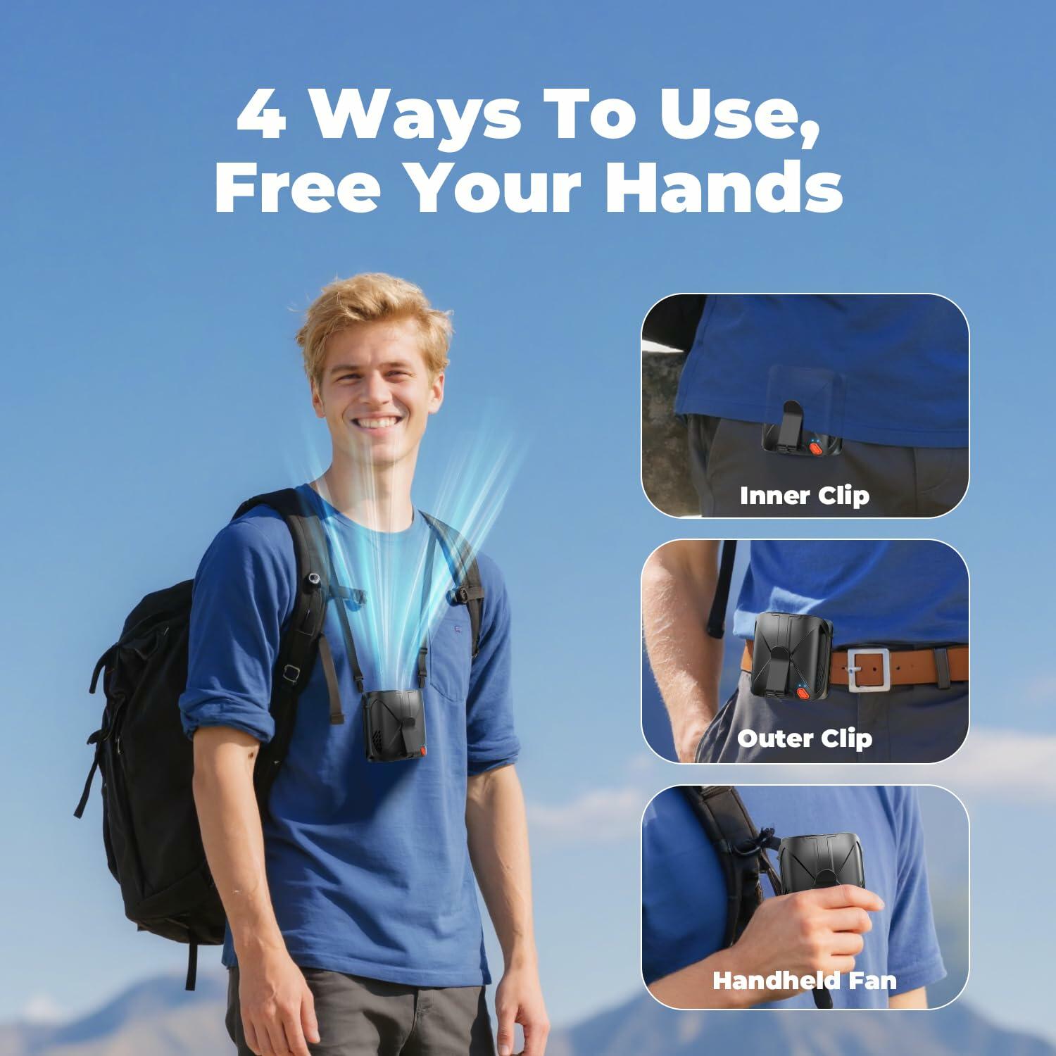 - 【4-in-1 Portable Fan】Wear it around your waist, hang it with the adjustable neck strap, use it handheld or place it on any desktop. Lightweight and compact, it's perfect for workouts, hiking, office use, or relaxing at home. The space-saving design delivers cooling comfort wherever you go.