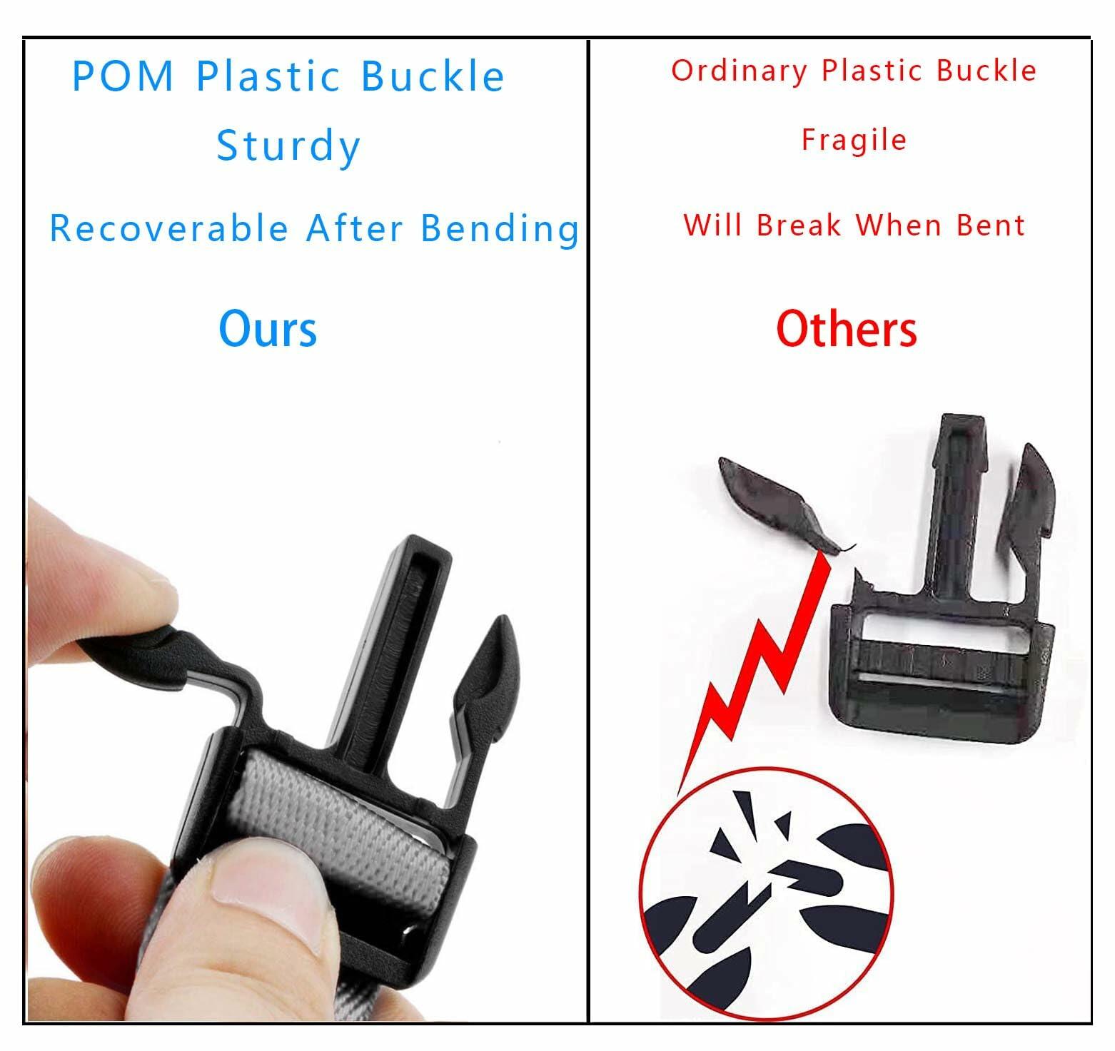 POM Material: Strong toughness plastic, The buckle is made of high-quality polyoxymethylene (POM). Hard strong side release buckles make your DIY stuff perfect and strong. Heavy-duty buckles are easy to install and adjust, with a smooth quick-release mechanism, make the webbing slide in and out of the ends with ease. the male and female buckles of the buckles produced by different manufacturers are not the same, please do not take them apart and mix them with other manufacturers' buckles