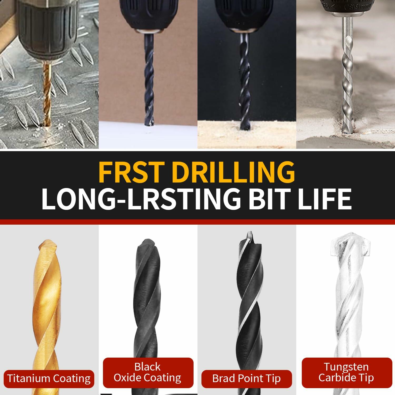 - Excellent Material: The drill bit set is made of high-quality carbon steel and high-quality high-speed steel materials. Titanium coating and black oxide coating help improve the accuracy and efficiency of drilling into wood and metal surfaces, ensuring long-lasting strength and durability.
