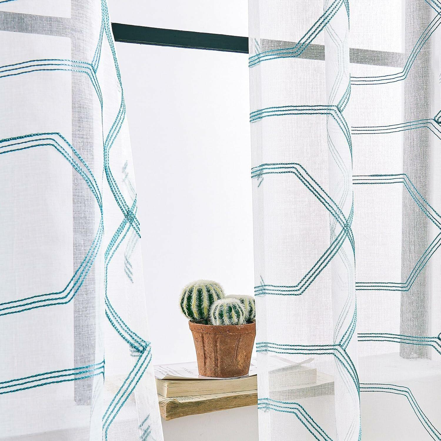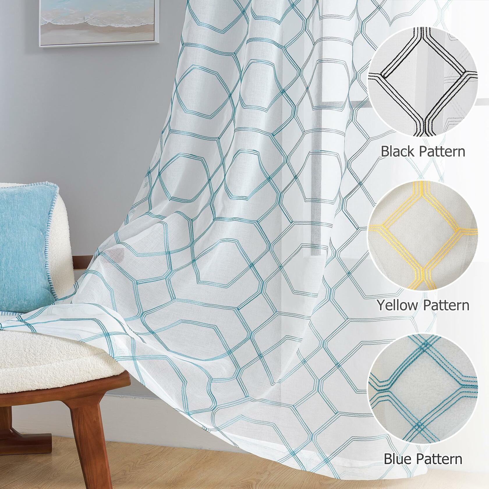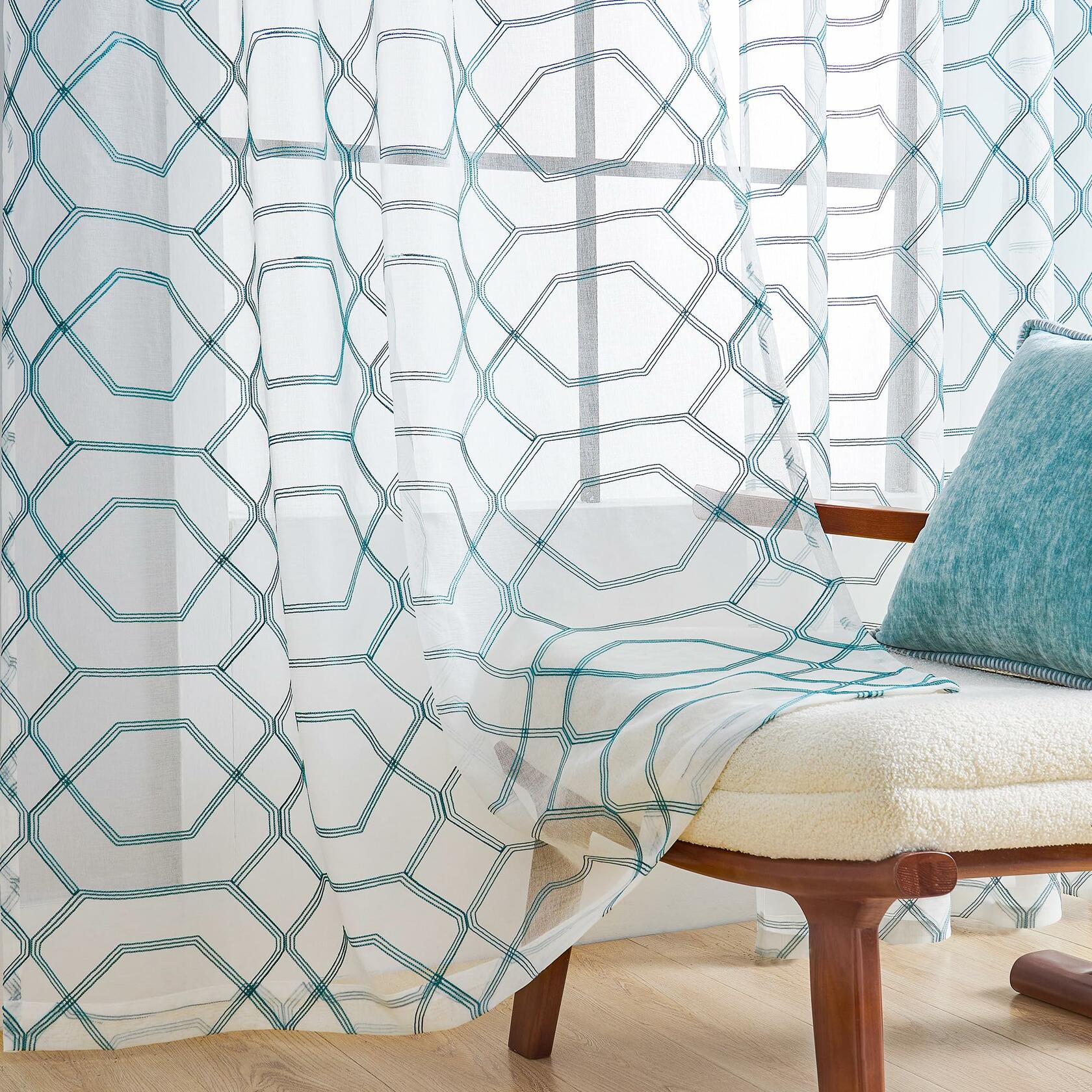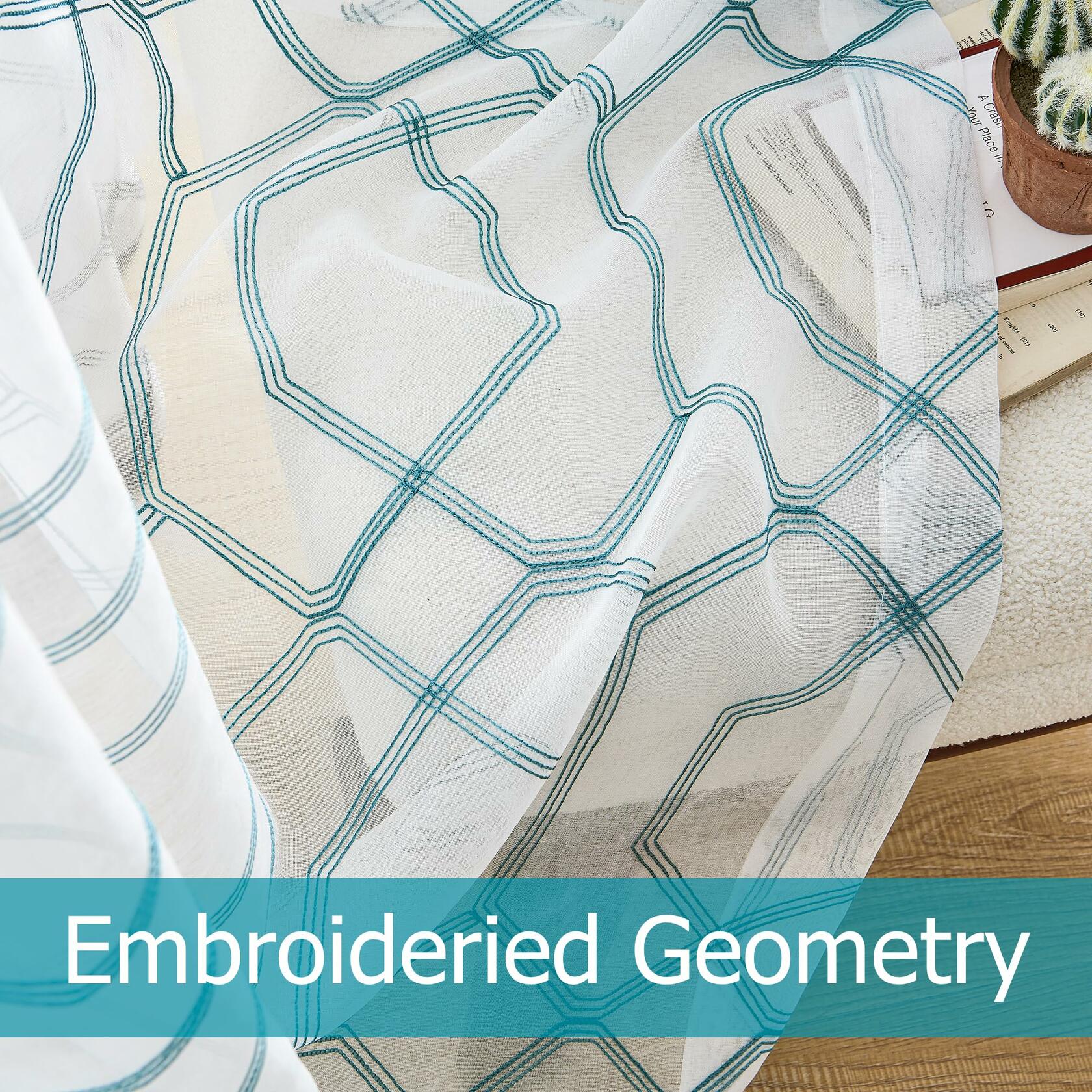 The embroidered sheer window curtain panels feature simple geometric patterns with delicate embroidery for a touch of boho style, enhancing the overall ambience of home and adding morrocan aesthetic to your room. Fabric:Our sheer curtains for living room are crafted from premium polyester fabric,enough sheer but resists wrinkles and wear, morvoer,easily maintain a natural drape when hung.Function:these geometric curtains sheer are highly breathable, promoting excellent air circulation and enhancing indoor air quality. Moreover,they effectively filter light to prevent direct sunlight, resulting in a pleasant and comfortable home atmosphere.Opacity:The embroidered curtains for bedroom are almost see-through and should be used with other sheer curtains blue. if you have more privacy requirements.Pattern:the geometric patterns looming on sheer drapes are stylish yet unique,bring a moroccan charming to your windows.The simple style of the sheer window curtains complements the natural rustic style of modern farmhouse décor. an excellent choice for decorating a modern farmhouse.Design white sheer window curtains are embroidered with a traditional embroidery pattern to create a retro aesthetic.They are perfect for country cottage interiors.Style-These sheer living room curtains bring a a new look to your modern farmhouse with its bold and minimalist geometric patterns.Color-The geometric patterned curtains are blue green tone, have a modern stylish that can be perfectly combined with different styles of rooms: art deco, casual, contemporary, mid-century modern, rustic and country style, no matter where they are hung, they can dress up a delicate and elegant home space for you.Usage Occasion:sheer embroidered curtains are white and blue in color, funky appearance, compared with other ordinary pure sheer blue curtains more suitable for decoration, prefect for living room,bedroom, dining room, kittchen, sunroom, study, kids room and even home office.Pocket on Top:the rod pocket sheer curtains are easy to install and slide, do not worry on grommets coming off. Care Instruction:the modern window curtains sheer are pretty strong and wear-resistant, which makes these curtains applicable machine wash in cold water, gentle cycle, tumble dry low.
