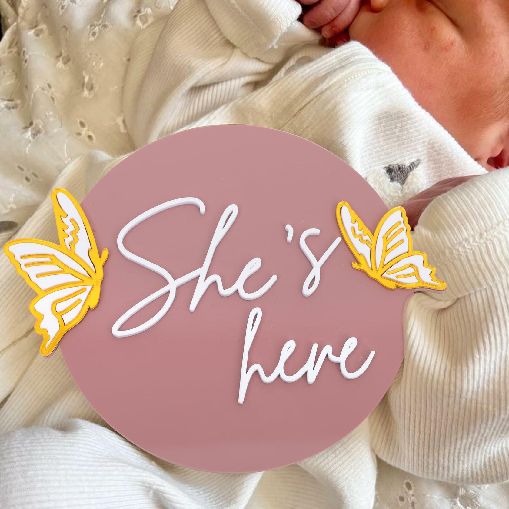 - SHE'S HERE MILESTONE DISC: Beautifully Designed She's Here Disc Is A Great Addition To A Gender Reveal Party, Creating An Atmosphere Full Of Surprises And Fun For All Of You. It Will Immortalize The Birth Of Your Little Princess