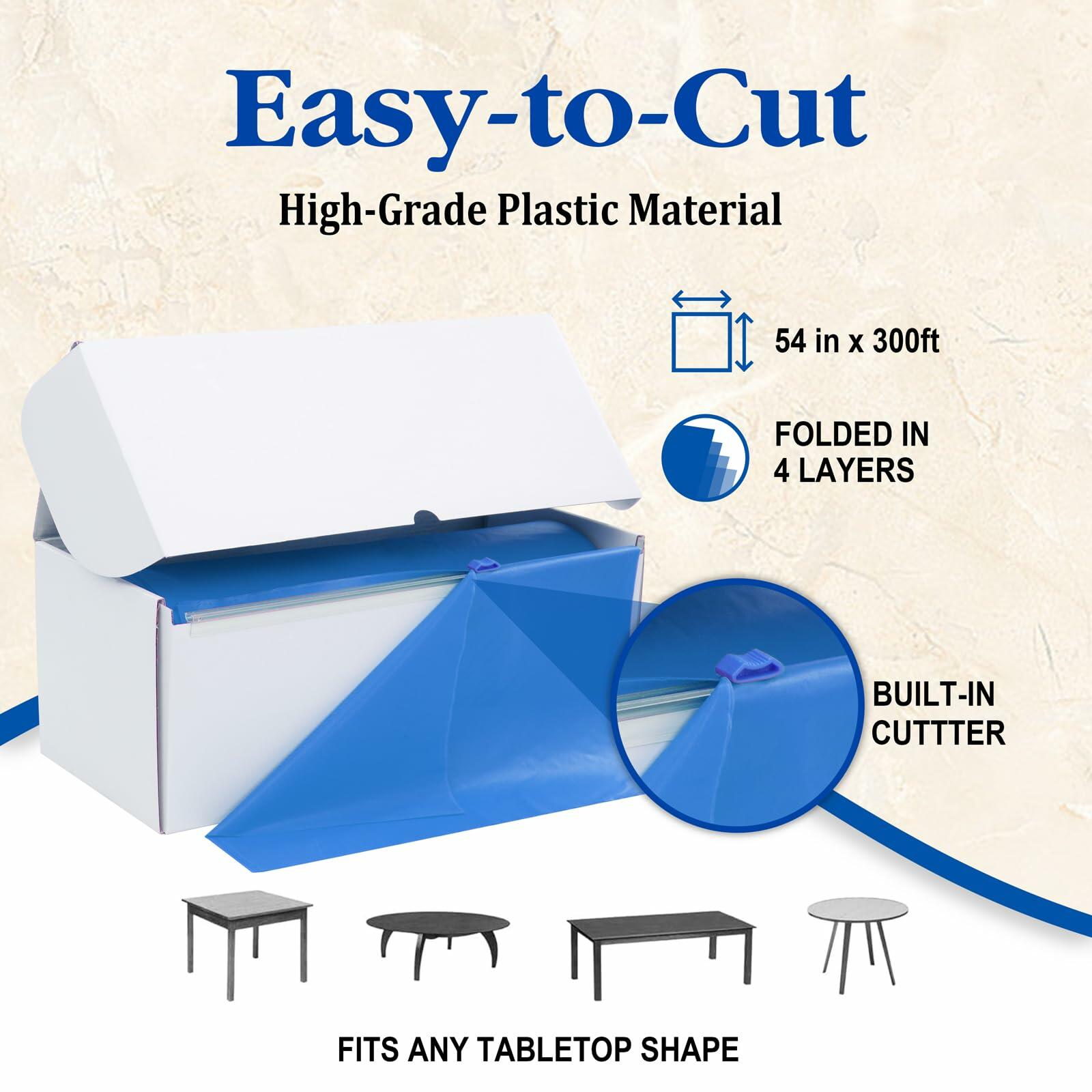 NEW PRODUCT ONLY THE BOX IS A LITTLE DAMAGEDWDF 54 Inch X 300 Feet Blue Plastic Table Cover Roll-Disposable Tablecloth with Slide Cutter for All Type/Shape Tables