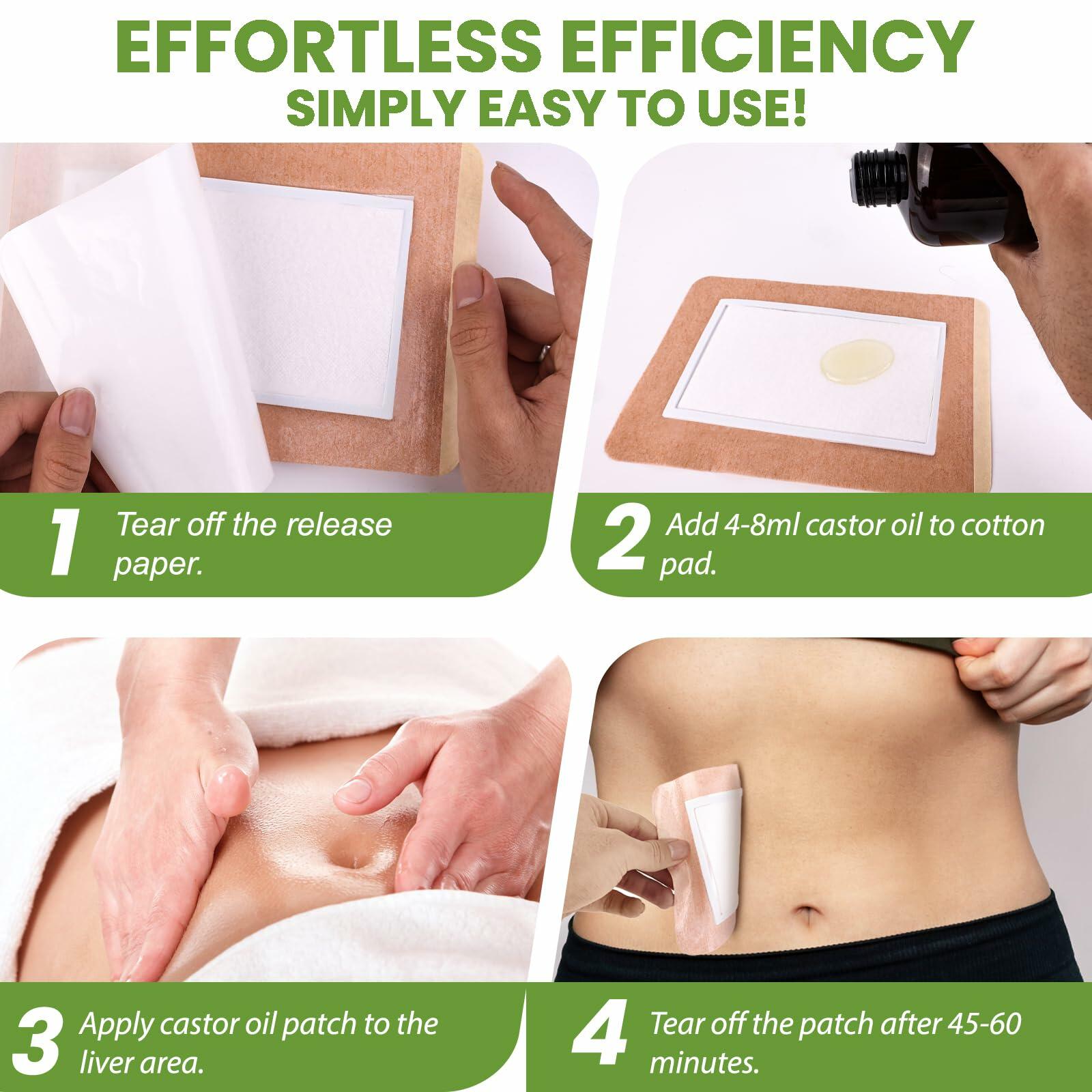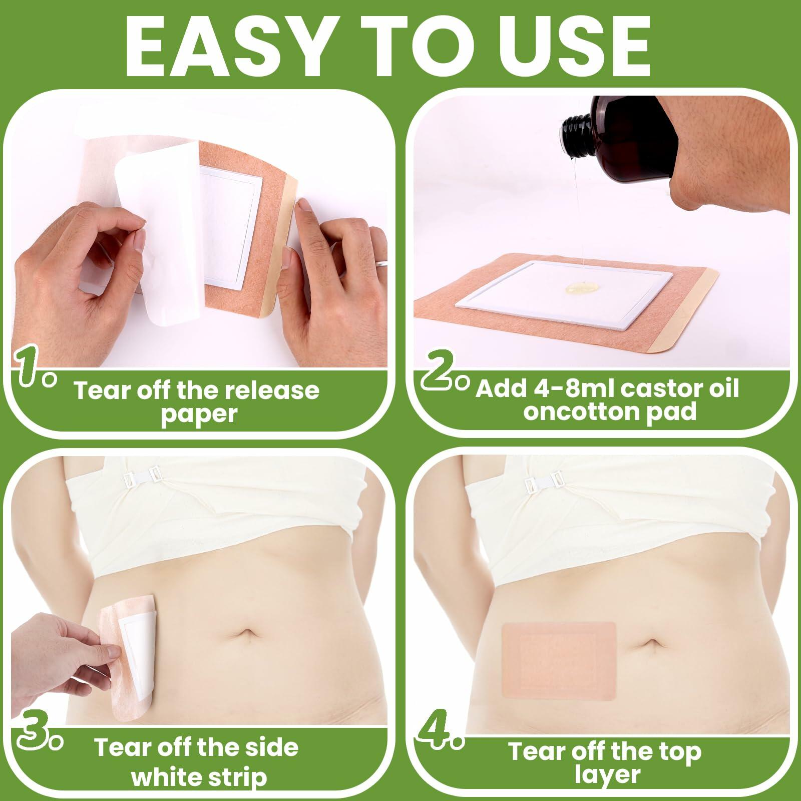 - How to Use- 1.Remove the backing paper. 2. Pour the right amount of wellnessamz black castor oil or others essential oil onto the middle of the cotton fabric. 3. Stick it onto your body anytime day and night. This organic cotton castor oil pack is more convenient compared to the traditional castor oil kit.