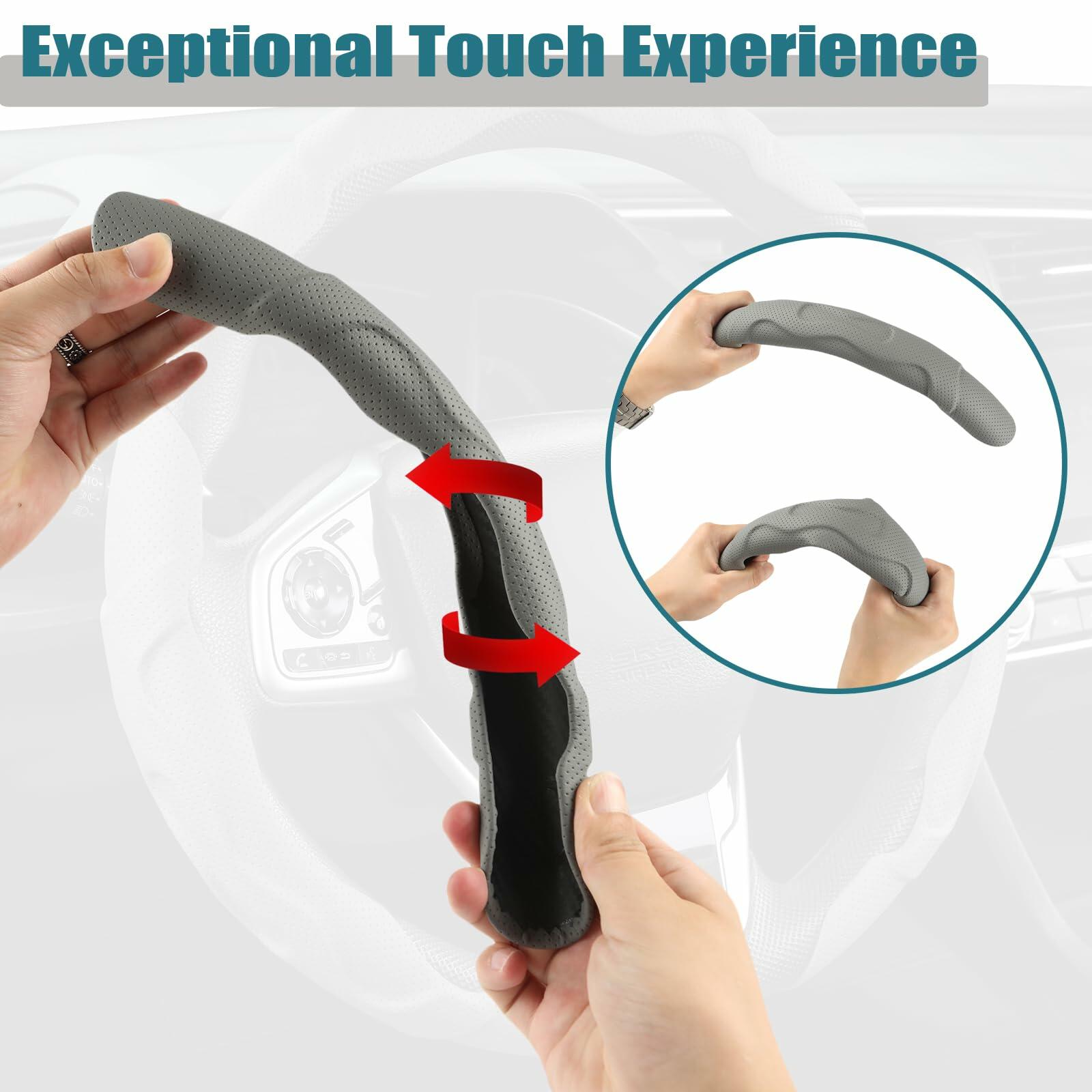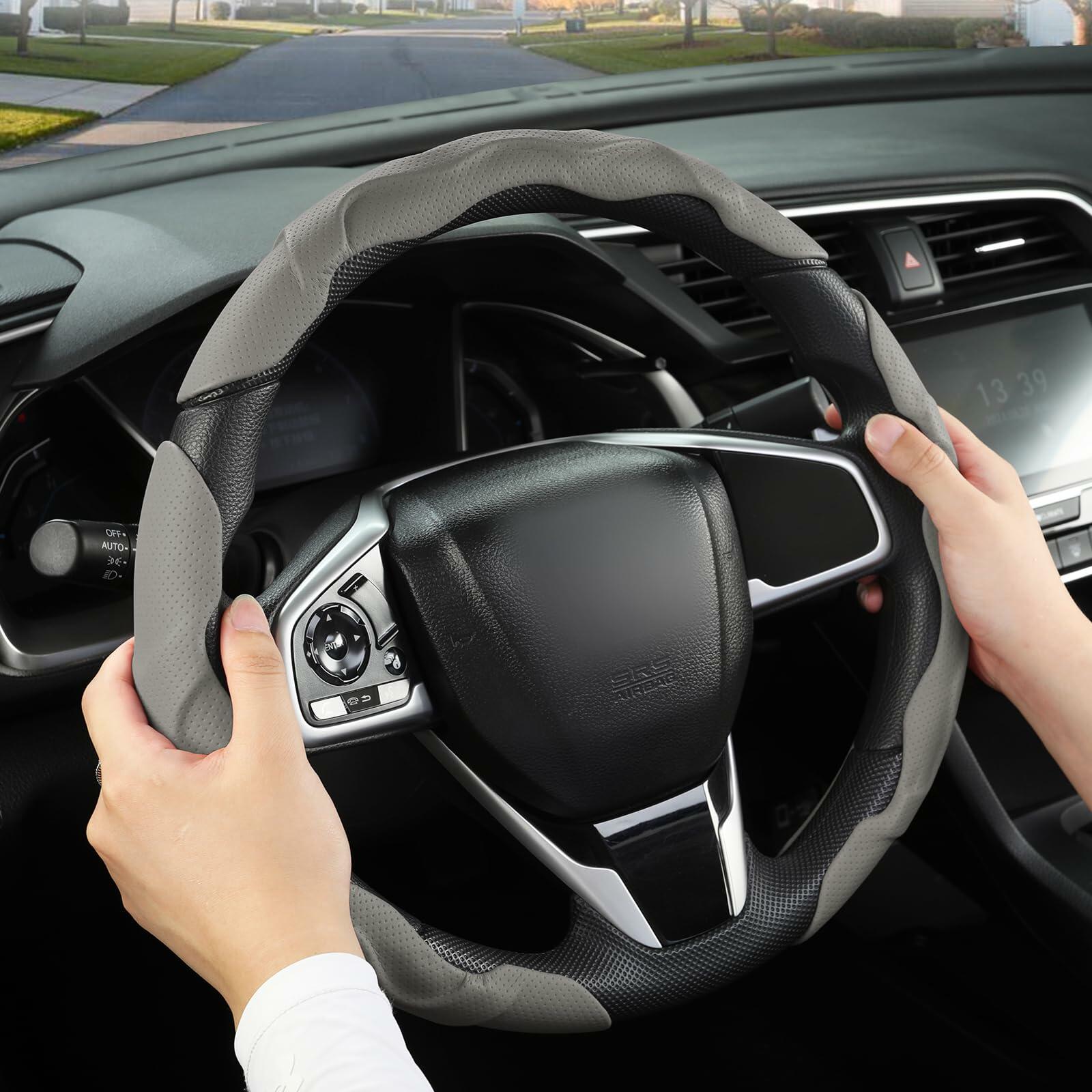 - 【premium material】The unique 3D breathable leather material,not only helps reduce sweat while driving but also enhances the stability of your grip on the steering wheel.Improving driving experience in both summer and winter.