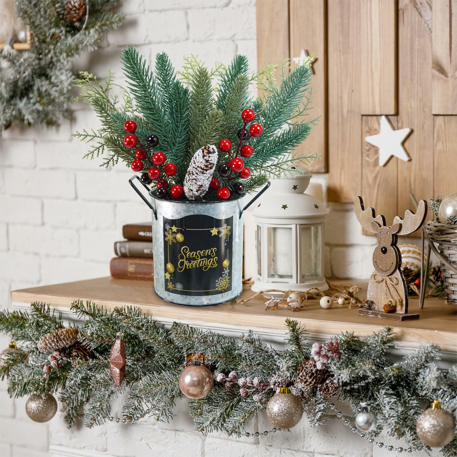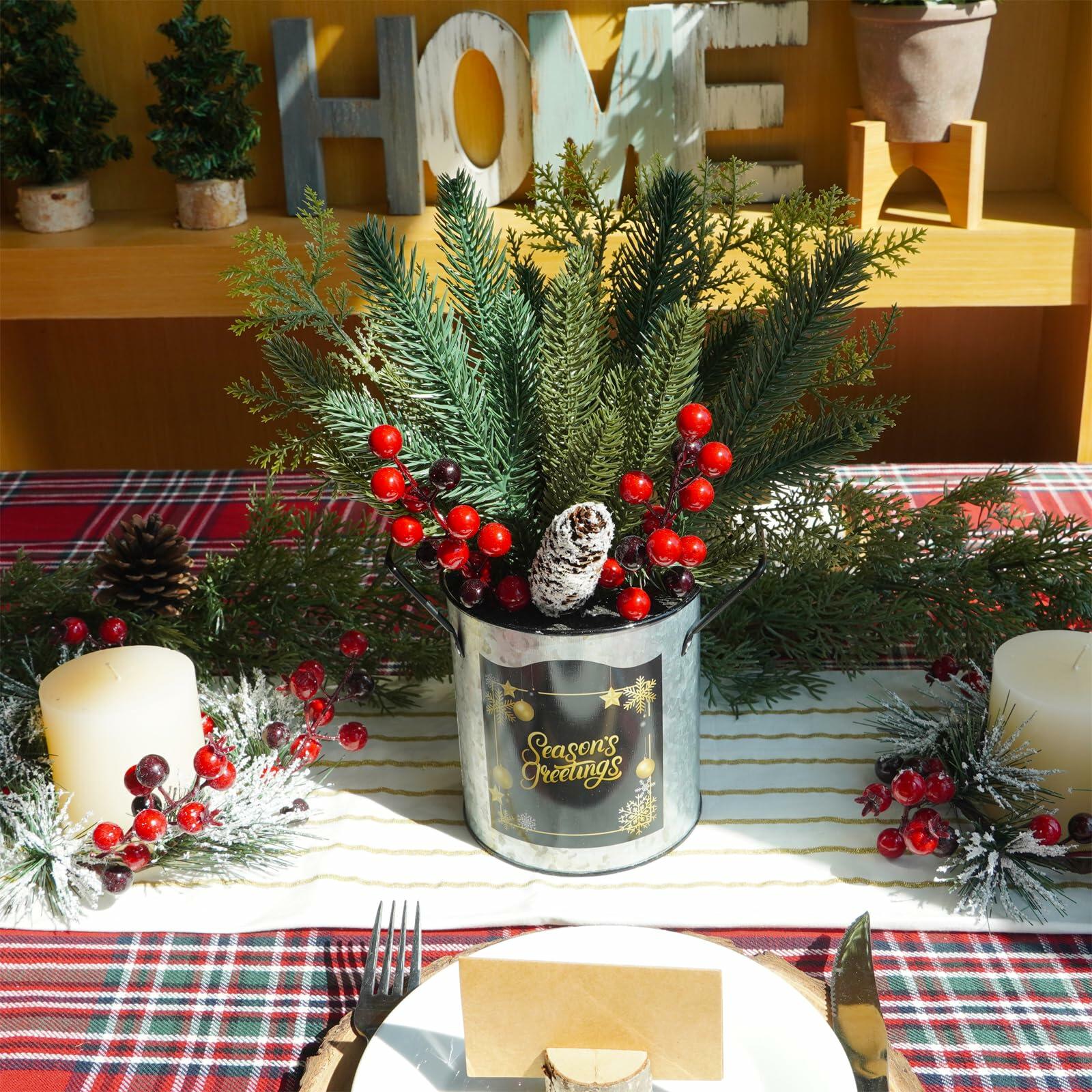 - Material: Artificial pine greenery and red berries made from plastic and foam. The metal planter is crafted from galvanized metal with foam inside to hold the Christmas picks securely. Lightweight and sturdy, it can be easily placed anywhere in your home. This modern Christmas table centerpiece combines winter beauty with a touch of rustic charm. As an artificial arrangement, it requires no watering or care and will always maintain its vibrant appearance.