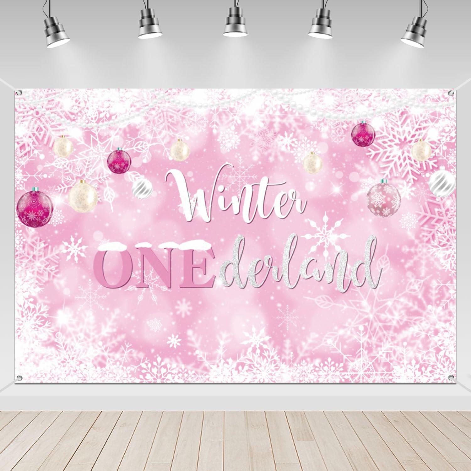 Winter Onederland First Birthday Banner Snowflake Backdrop 70.9x43.3 Pink