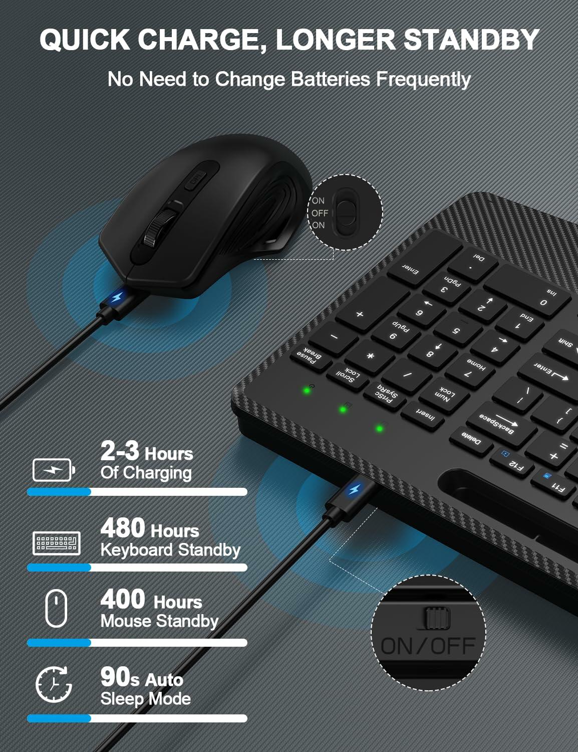 - 【RECHARGEABLE & SMART ENERGY SAVING】: The wireless mouse keyboard are equipped with rechargeable 500mAh and 1000mAh lithium battery respectively, they provide up to 2-3 months of usage on one charge, say goodbye to the hassle of battery replacements