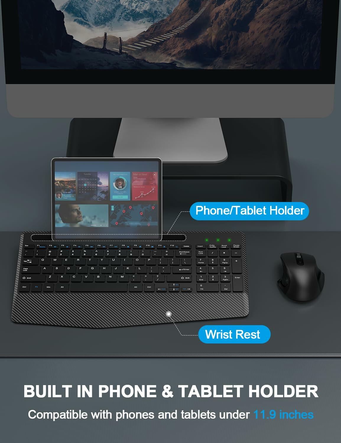 - 【PHONE & TABLET HOLDER】: The full-size wireless keyboard is designed with a large phone and tablet holder. Provides you with additional space to place your phone, tablet, or other gadgets. Accommodates phones and tablets under 10 inches