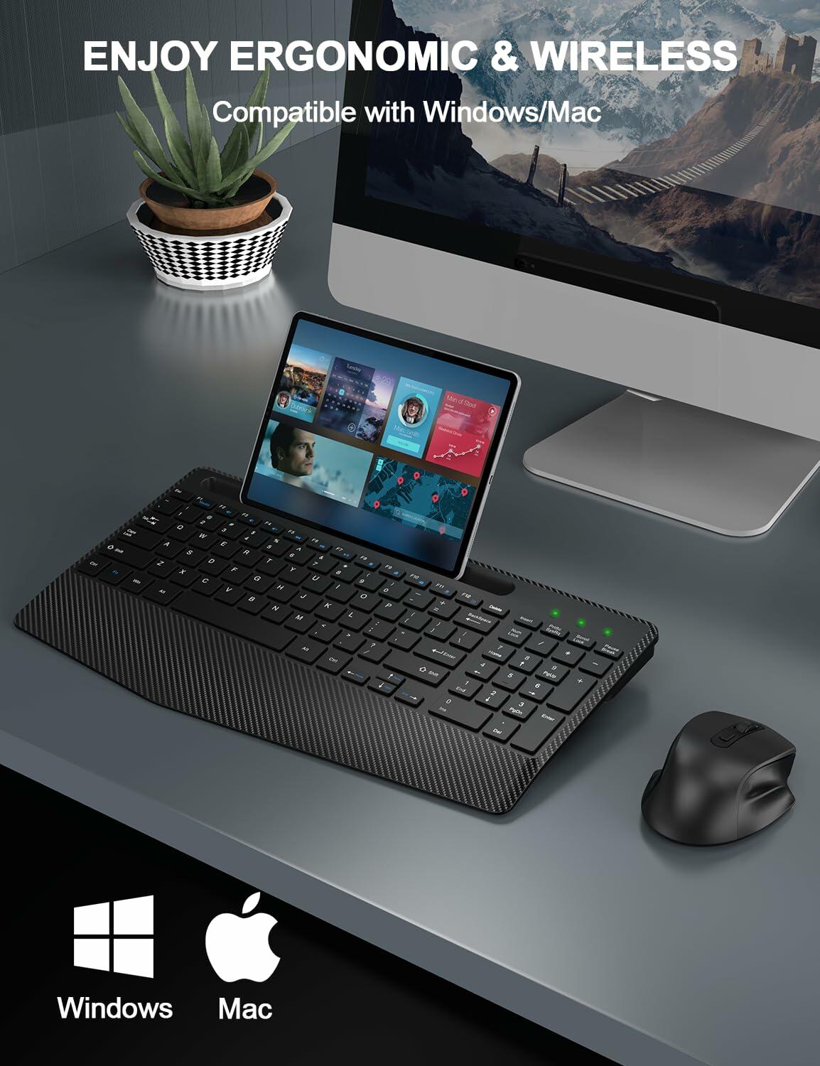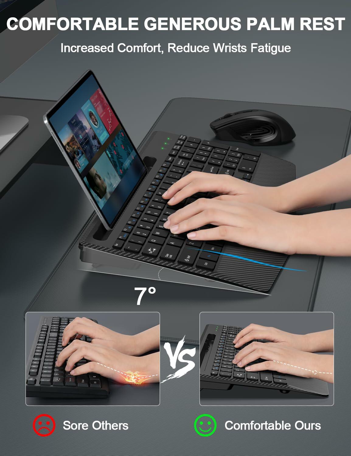 - 【BUILT FOR COMFORT】: The wireless keyboard with large wrist rest and ergonomic typing angle design provides support for your wrists and reduce twisting. Help your wrist in a comfortable position, and reduce wrist pain and fatigue after long hours of work
