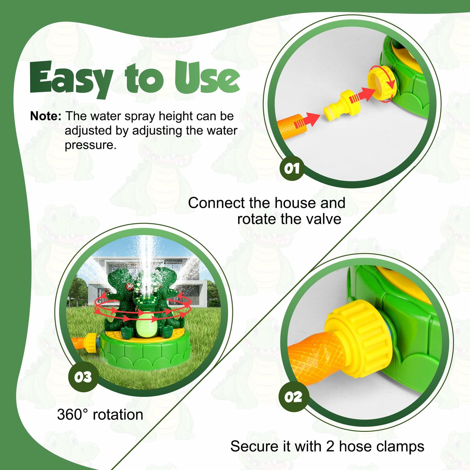 - Sprinkler for Kids ---- Summer has never been this much fun for the whole family. The dinosaurs sprinkler head is attached to the base, connect the hose to the sprinkler, and the water will automatically drive to start spray.