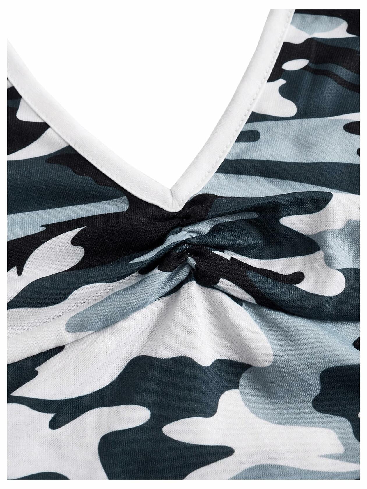 Women's Camo V Neck Sleeveless Crop Top Ruched Backless Dark Green Size M