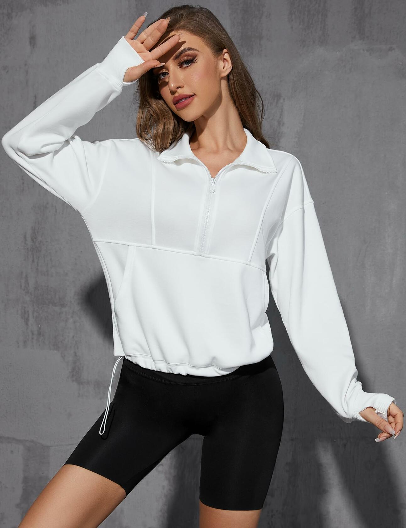 Womens Half Zip Pullover Sweatshirt White Fleece Crop Top with Pocket Size XL