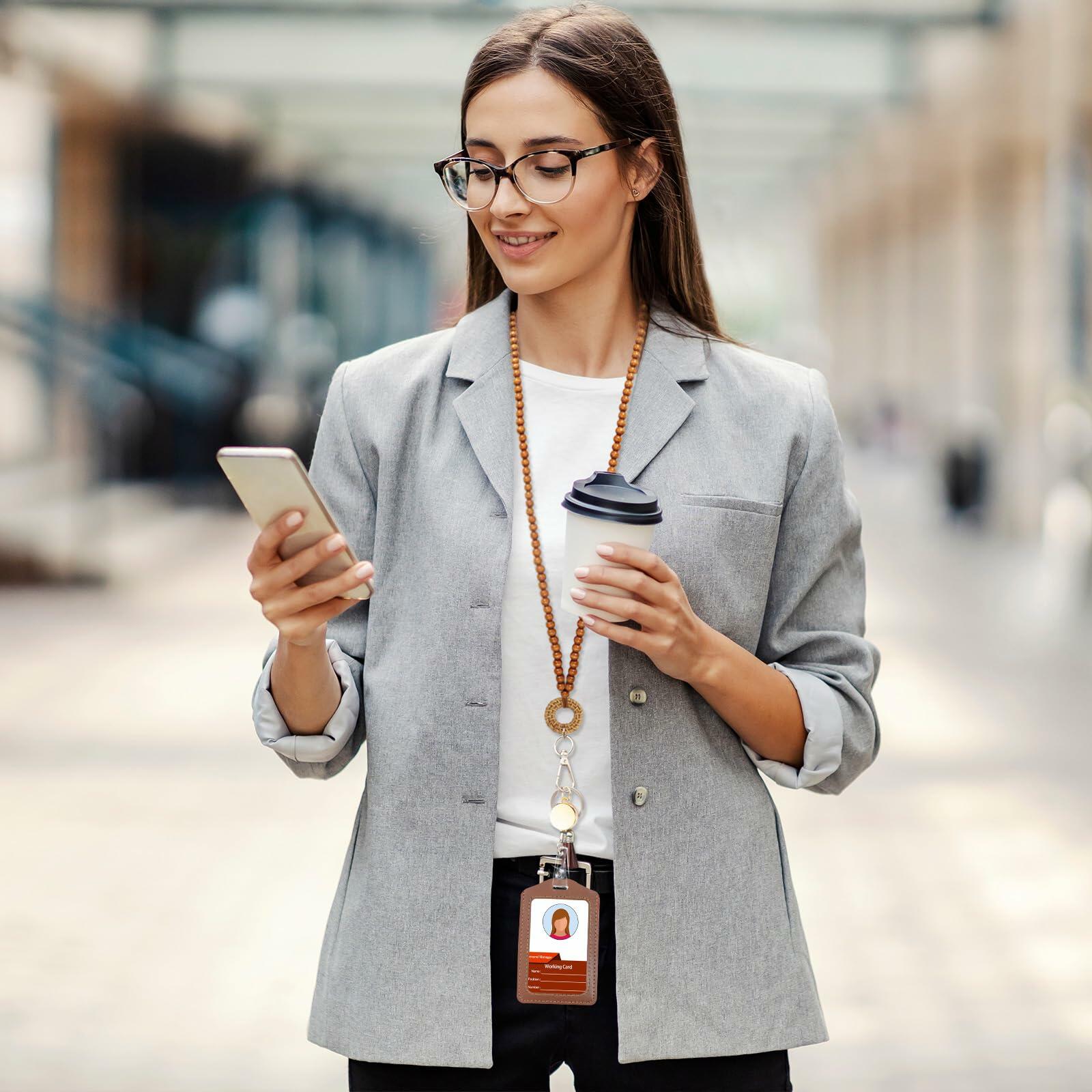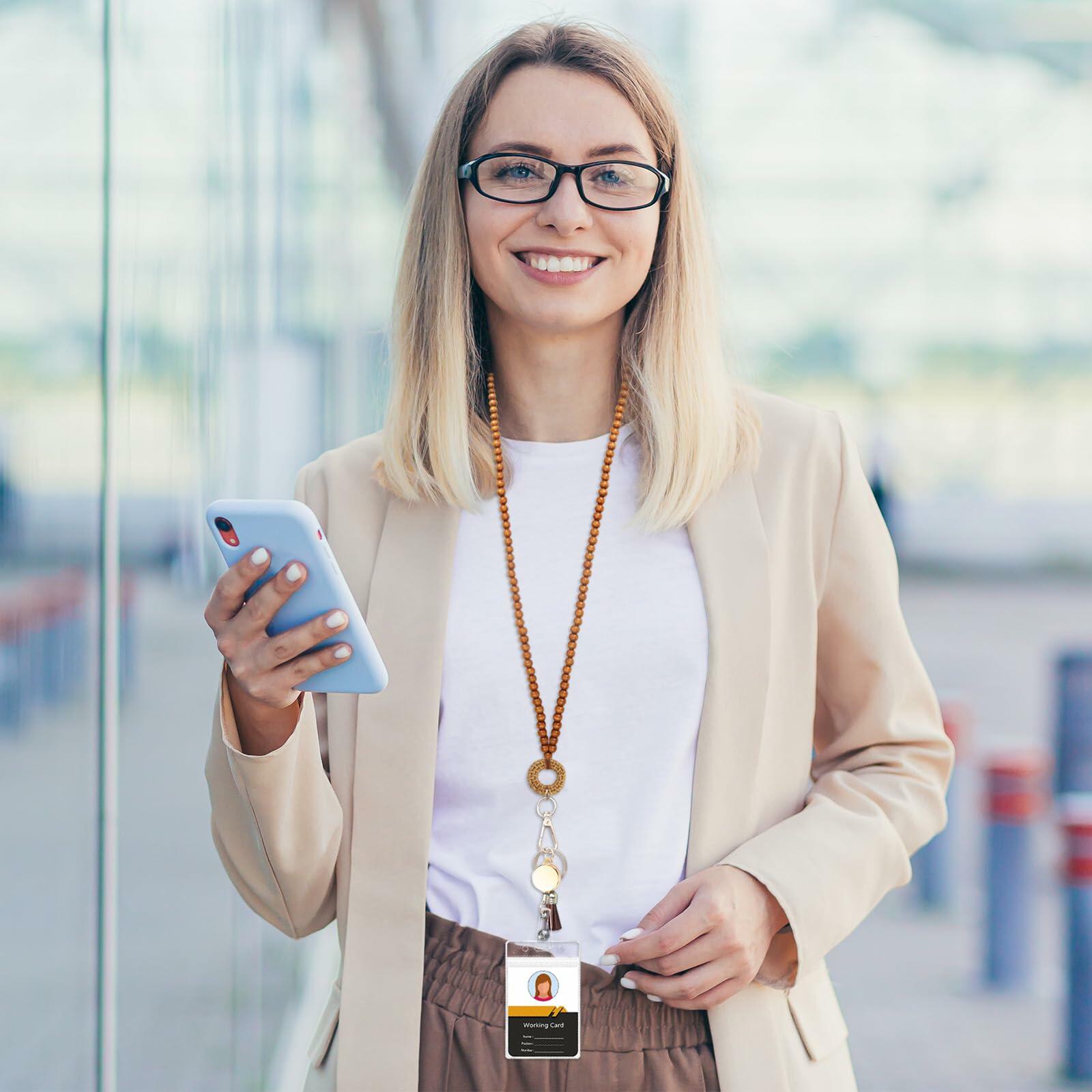 - Durable Material: The lanyard is made of natural wood beads, safe and healthy, original and natural;Leather card holder is made of soft and premium leather material;ABS card holder is strong and lightweight;Transparent ID holder is made of high quality PVC material, waterproof and wear-resistant;The metal reel is made of high quality zinc alloy