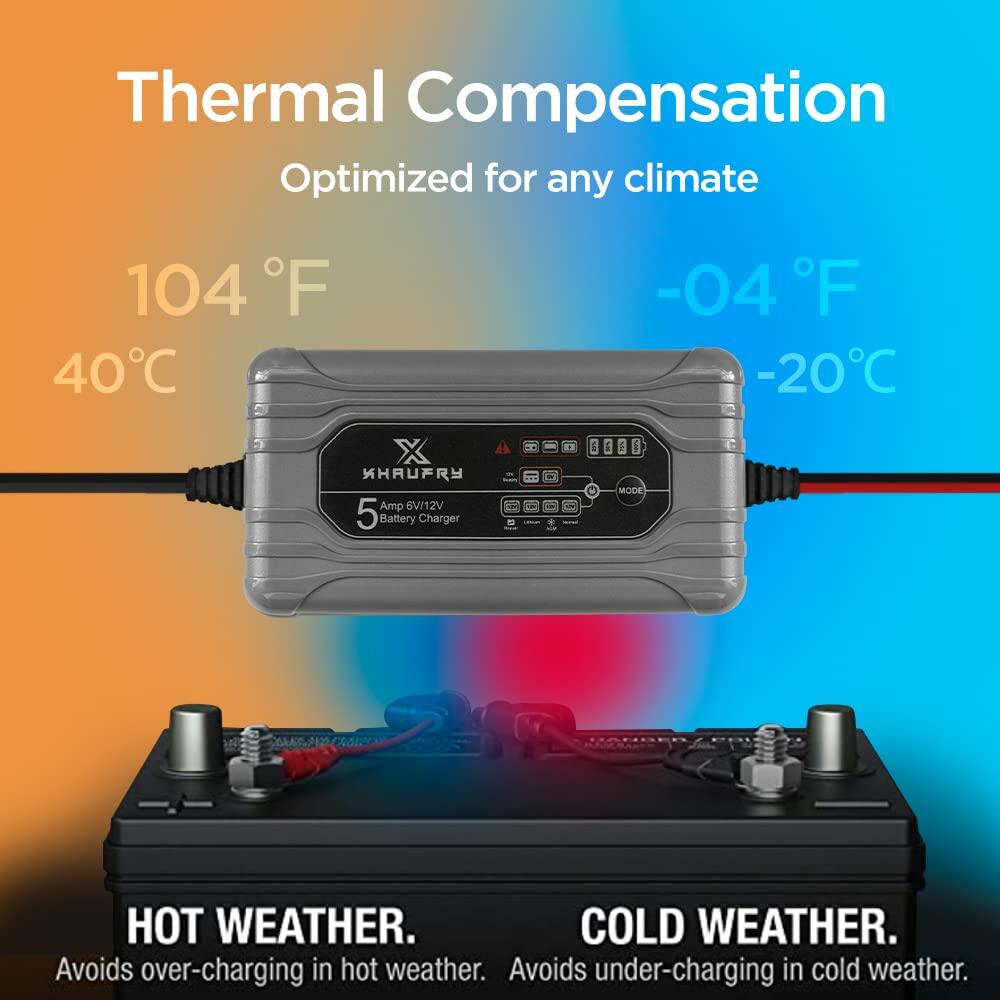 - An integrated thermal sensor detects the ambient temperature and alters the charge to eliminate over-charging in hot climates and under-charging in cold climates
