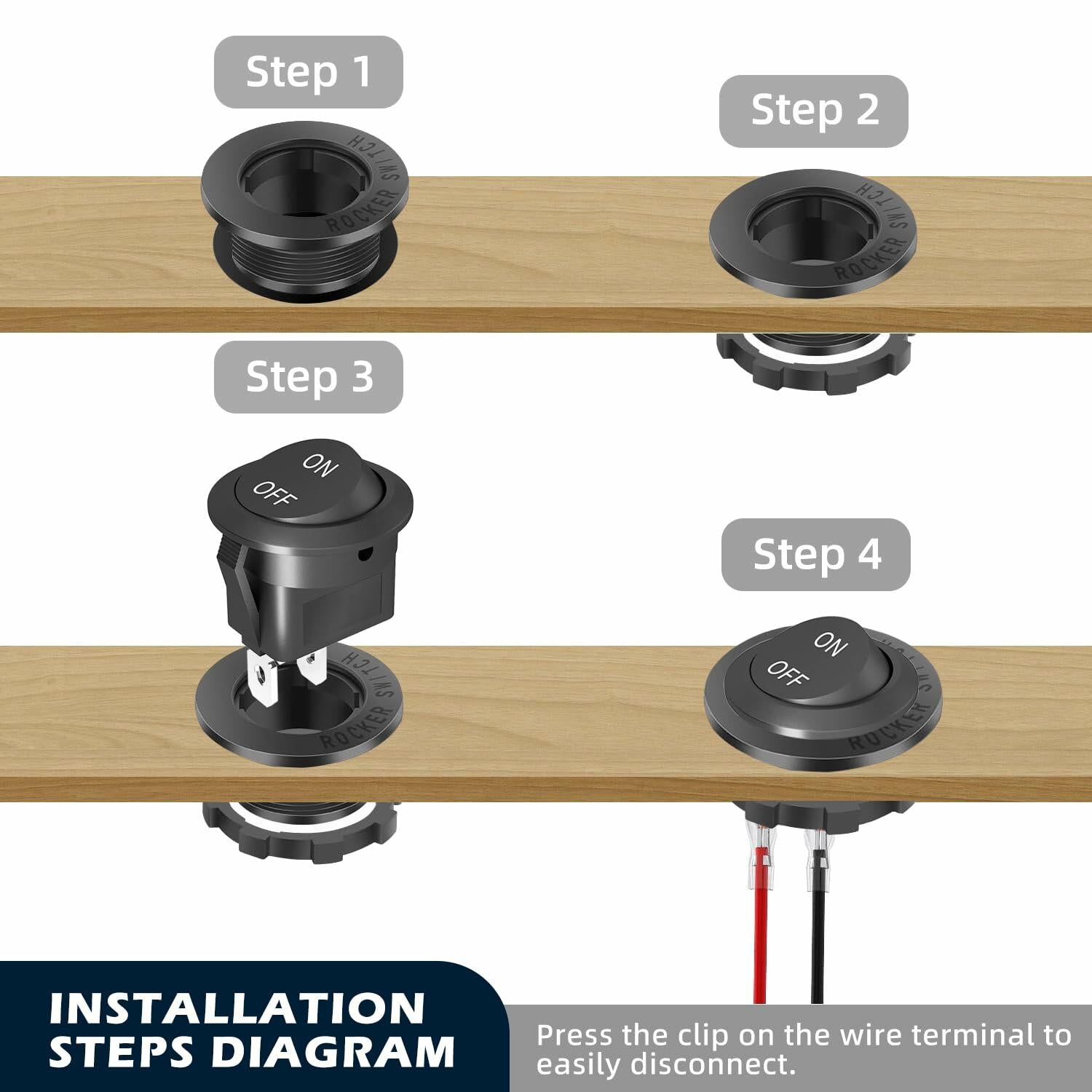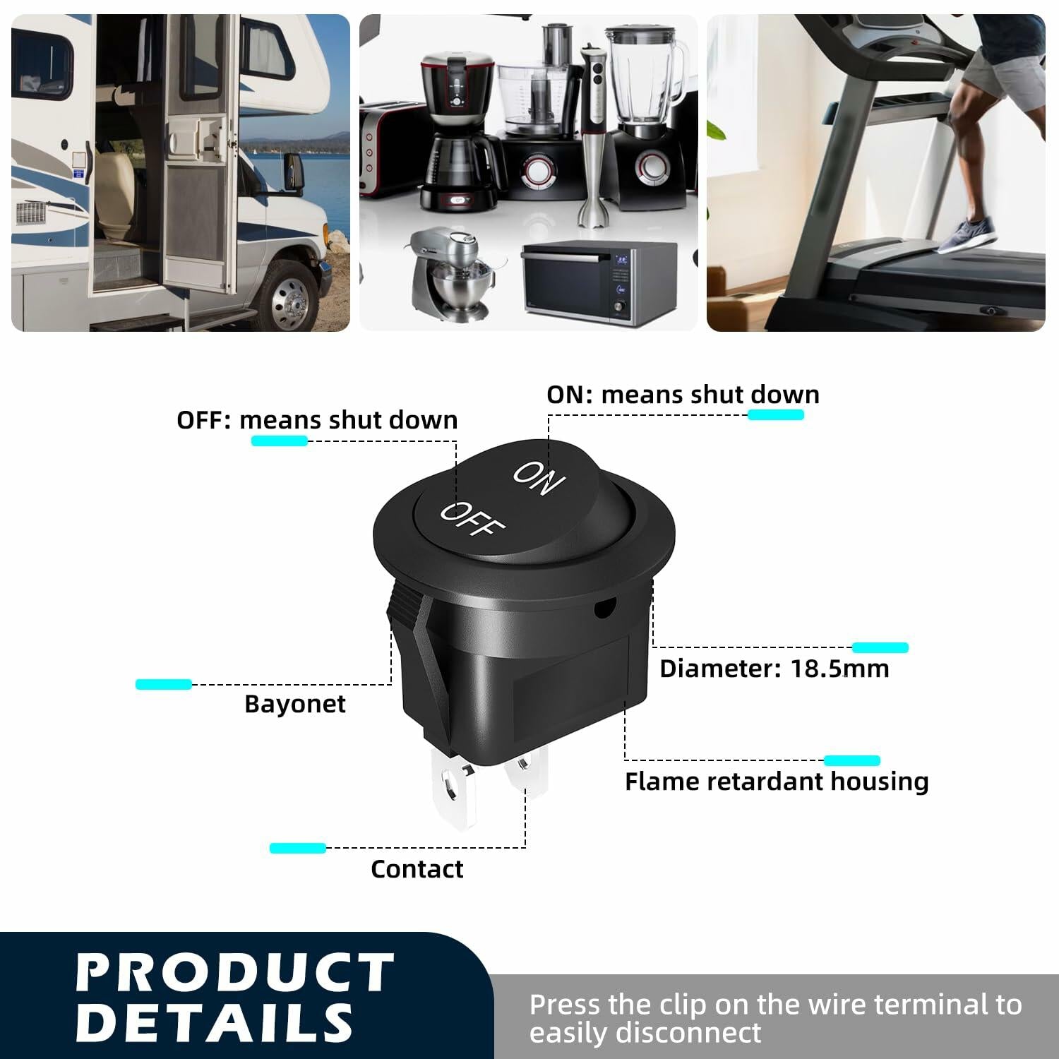 - Easy to Install Use: This is a electrical switch set, 2-pin switch design, each wire has an internal slot for easy installation and removal without damage (round rocker switch rating: AC 125V 10A / AC 250V 6A),these 3-pin switches can be installed on 0.9-inch (20mm) cutting size panels, which is convenient for the replacement and installation of equipment switches.