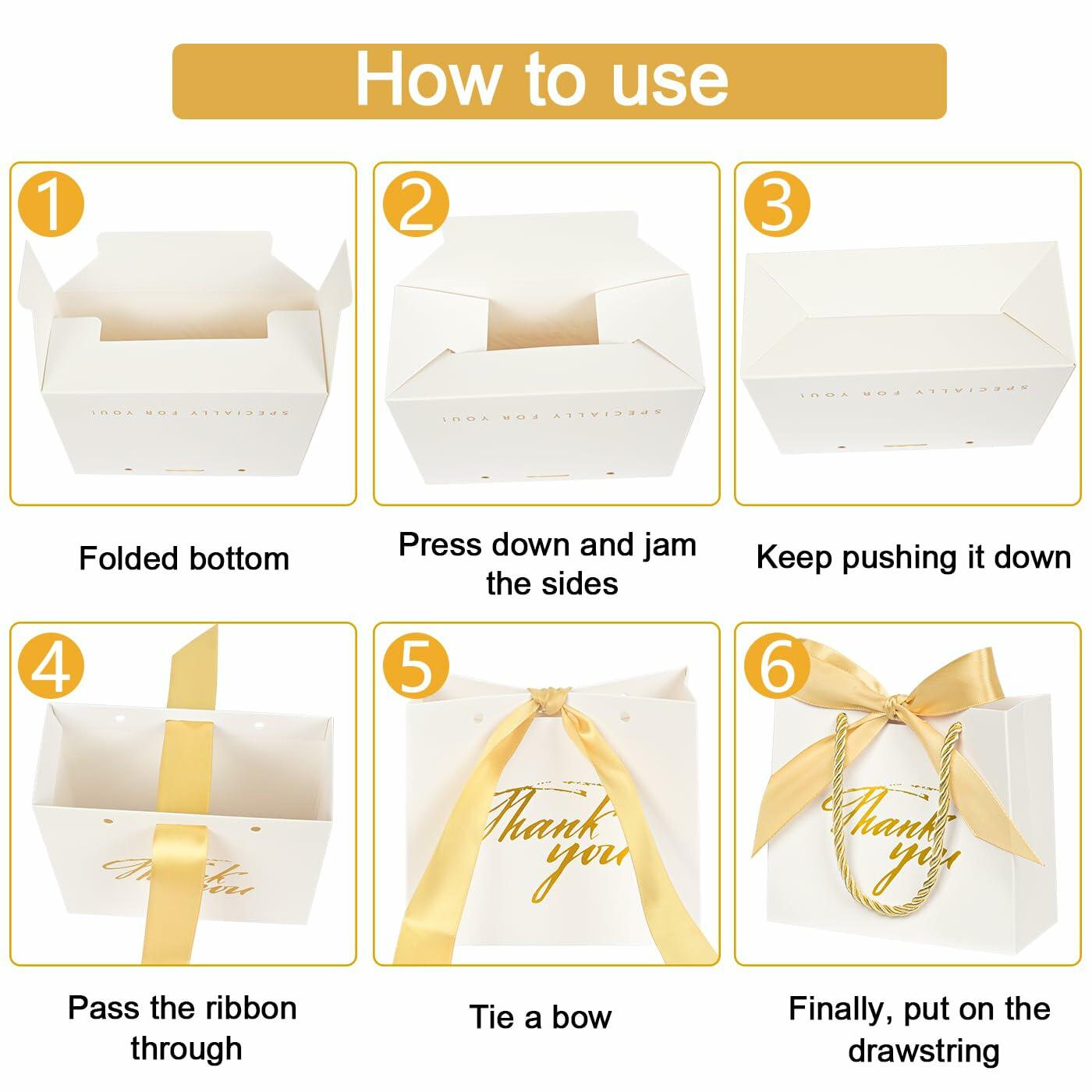 - 【Easy to Assemble】 This white gift bag is flat folded and can be easily assembled by folding along the crease line. You can also refer to the folding step-by-step diagram on the Amazon page to assemble the party favors candy boxes, which can be assembled in just a few simple steps and won't take much time.