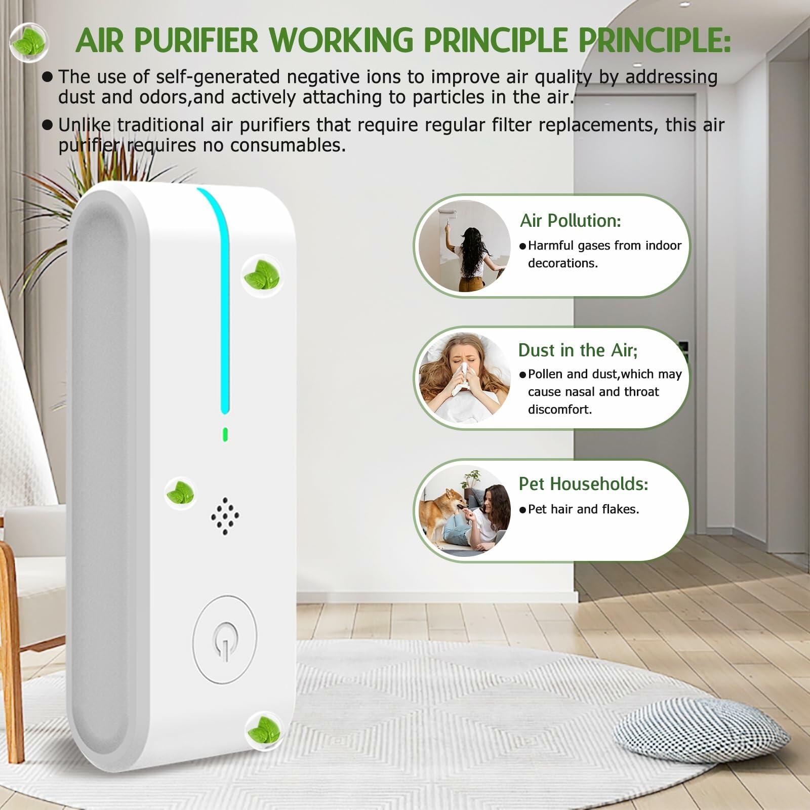 - 【Breathe Fresh Air Easily】 The portable ionizer air purifier adopts anion technology, refreshing indoor air naturally without filters or chemicals to effectively purify: pet odors, and other smells from rooms. Enjoy a relaxing breath of fresh air with peace of mind.