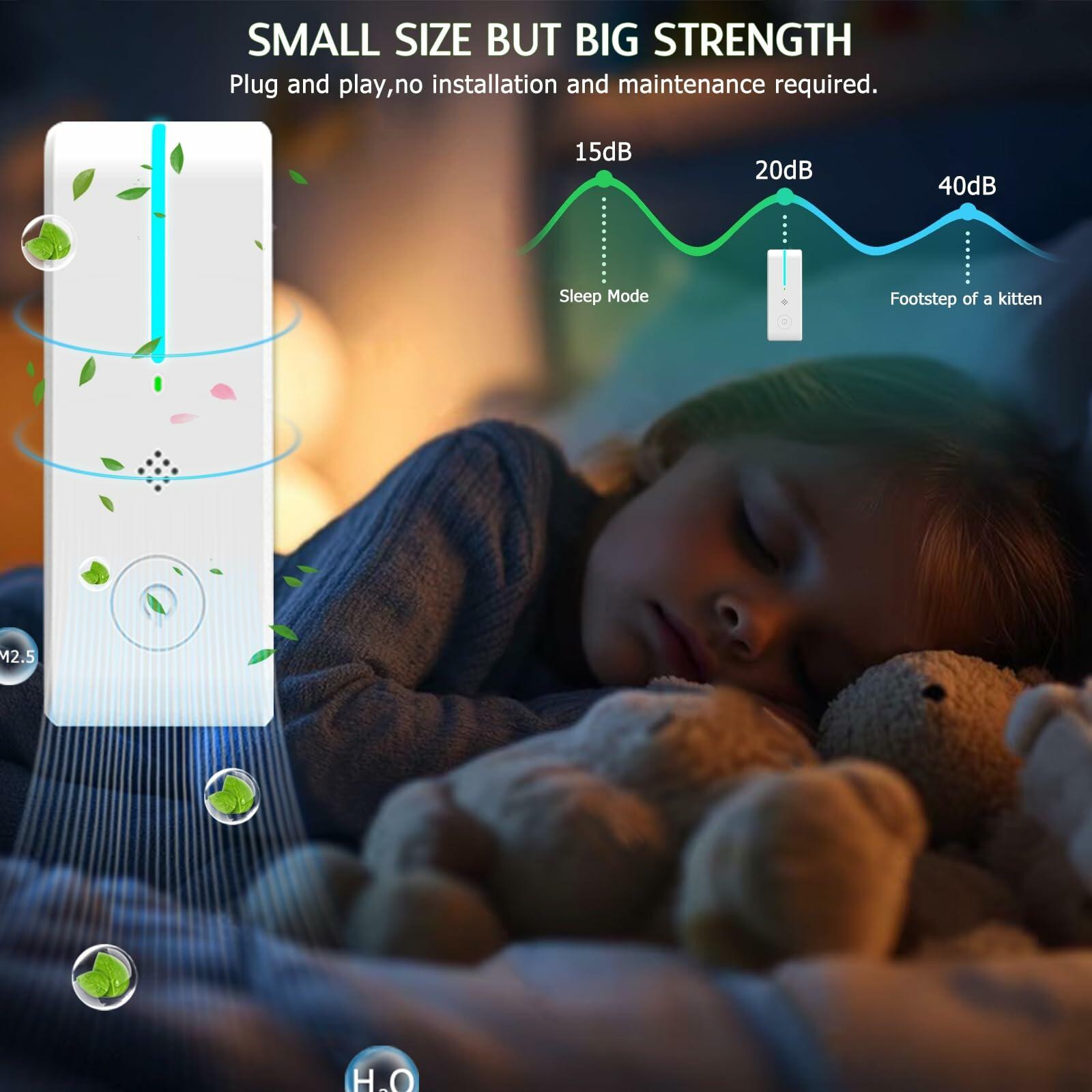 - 【For Whole Home/Office 】 At only 1.77 inches wide and 4.72 inches long.The plug in air purifier is suitable for bedroom,bathroom,kitchen,living room,garage,basement,gym,hallways and office use. We recommend using at least one per bedroom, bathroom, dining room, living room, and kitchen to ensure best results.