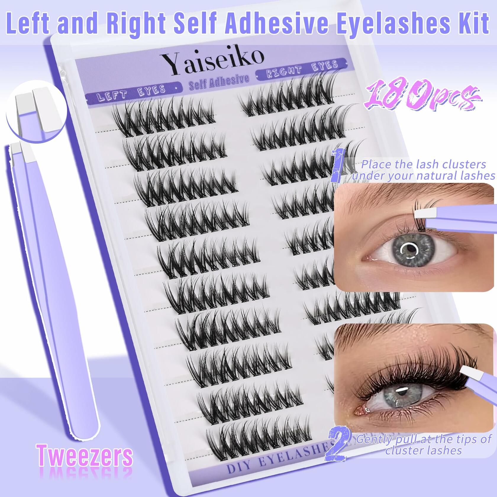 - 【Premium Self Adhesive Eyelashes Kit】Our self adhesive lashes are made with super fine quality silk fiber,contains 180 pcs 8-17mm pre - glued lashes clusters and 1 lash applicator.Simplify your beauty routine with our pre-sorted left and right eyelash clusters