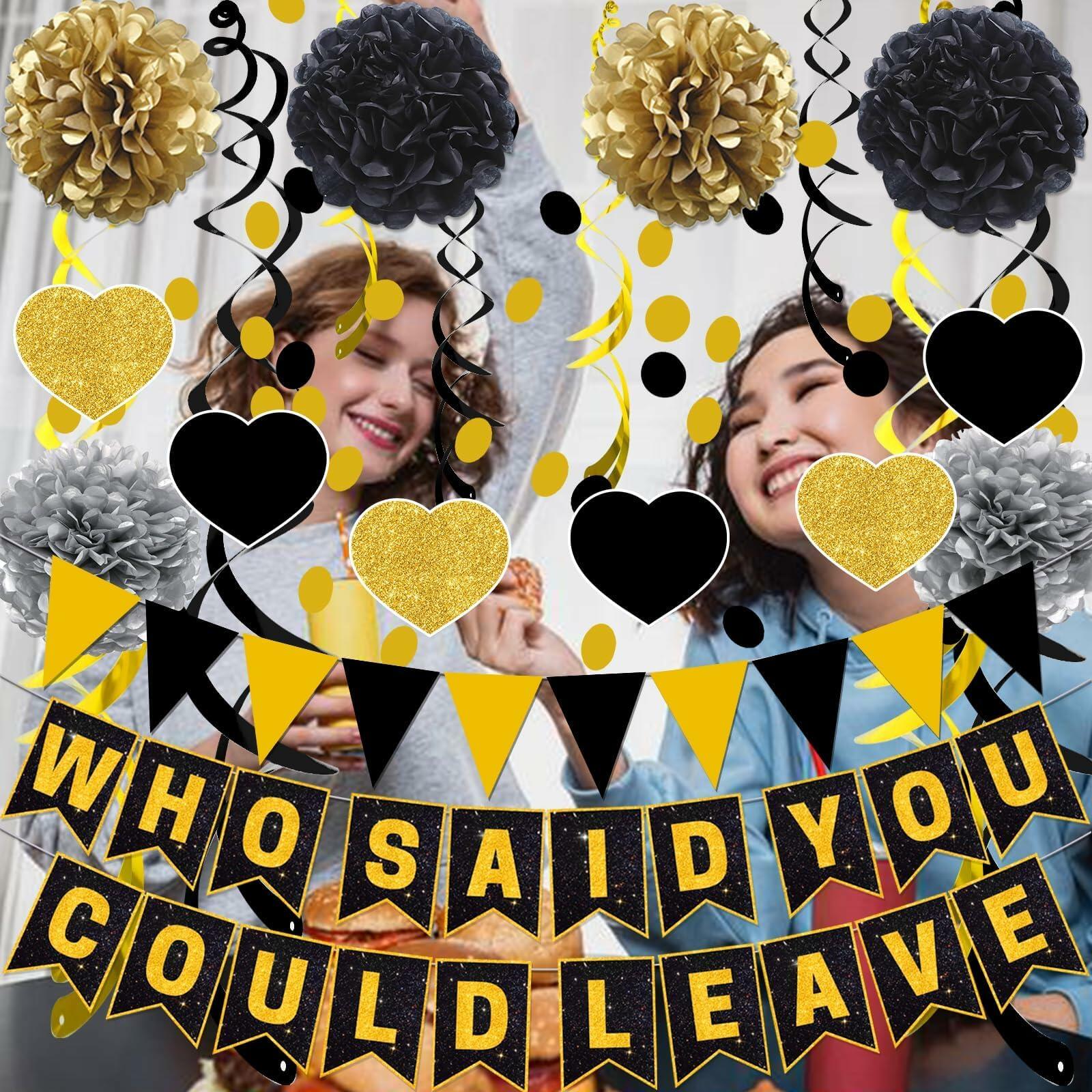 - Package Includes: You will receive 11 pieces of gold party decorations, 1pcs "WHO SAID YOU COULD LEAVE" banner, 6pcs hanging decorations, 4pcs honeycomb decorations to create an atmosphere for your party, farewell decorations party