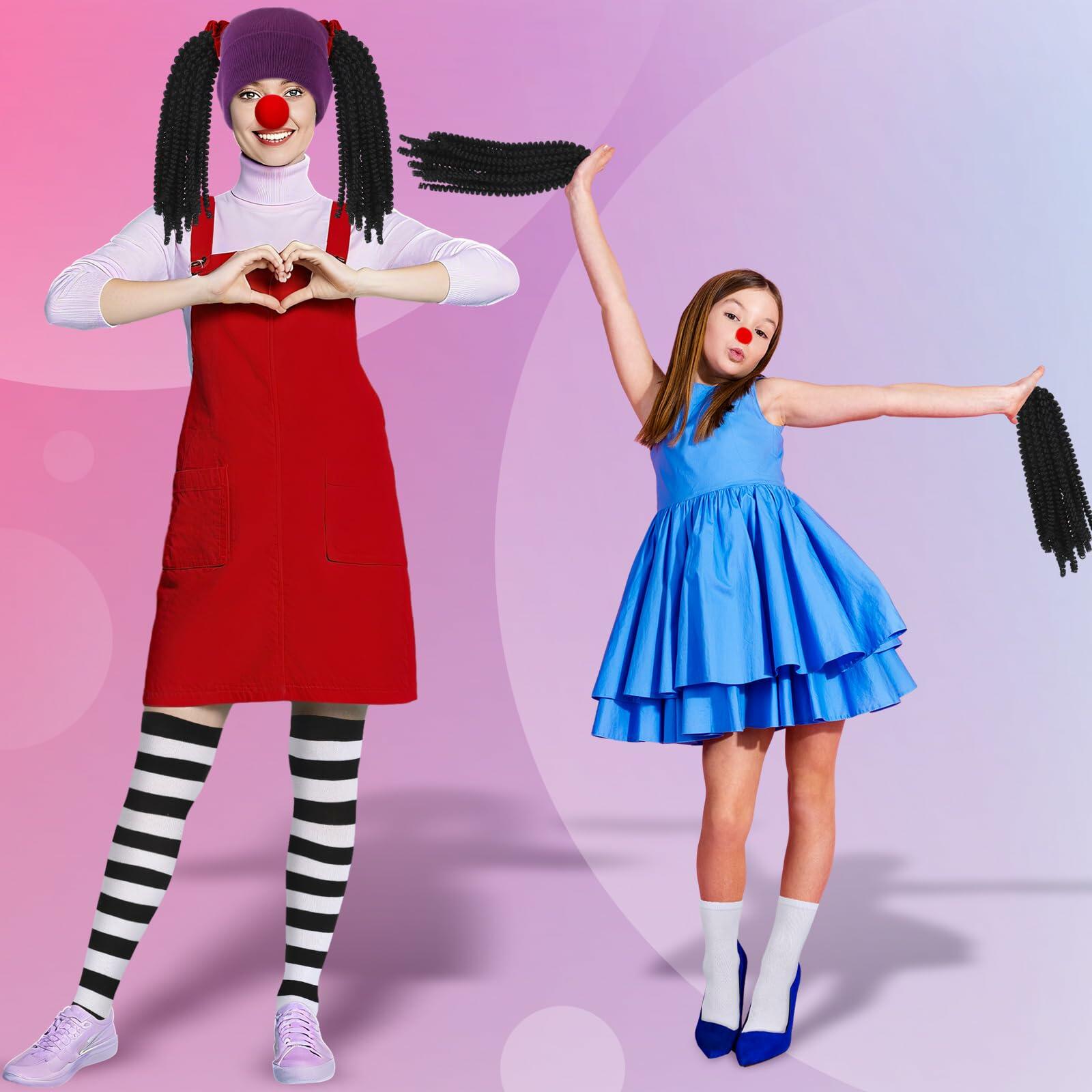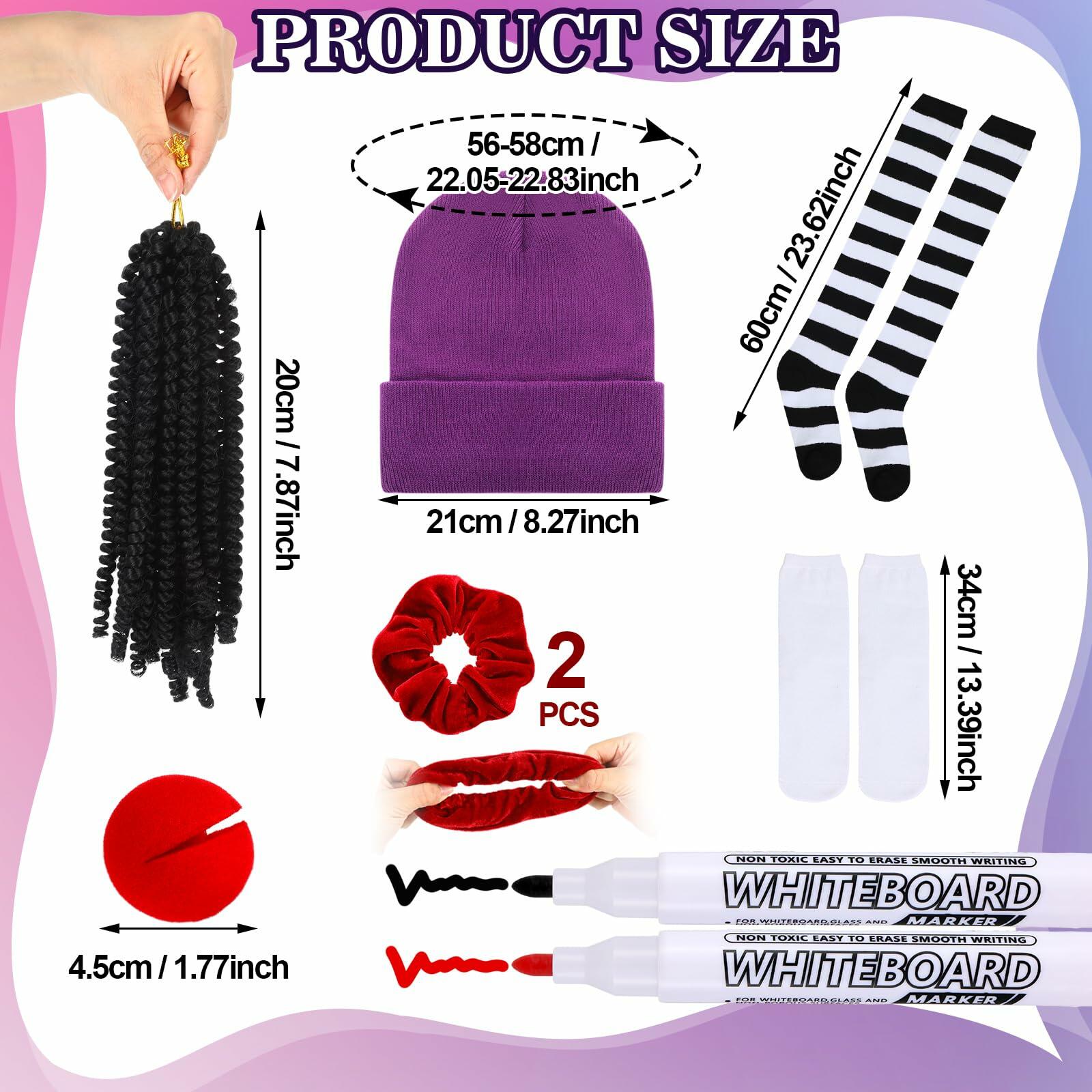 - Complete Set: clown costume accessories includes a purple knit hat, clown nose, a pair of black and white striped socks, two red velvet scrunchies, a black dreadlock wig, a pair of white socks (34 cm), and two markers (black and red)
