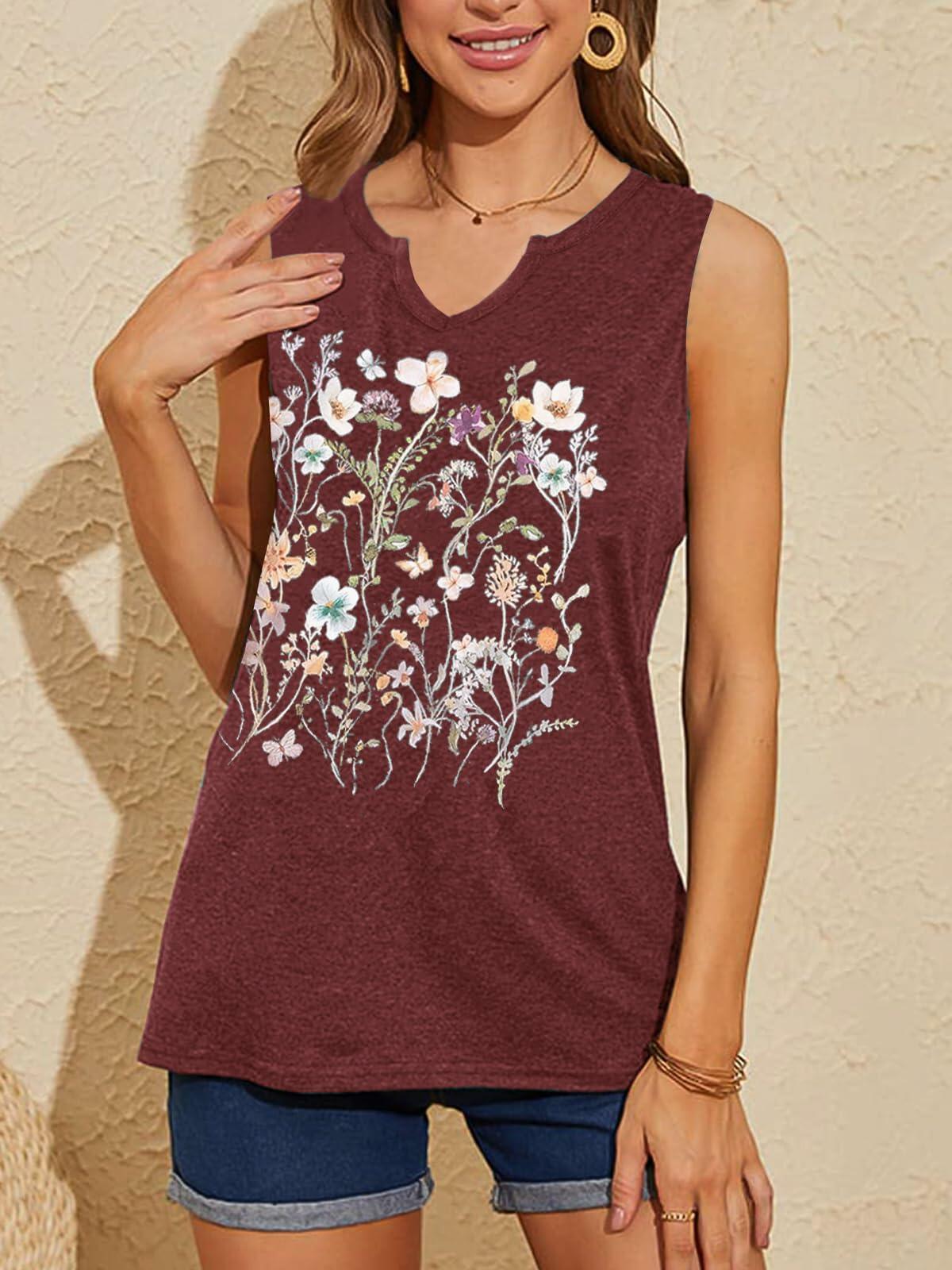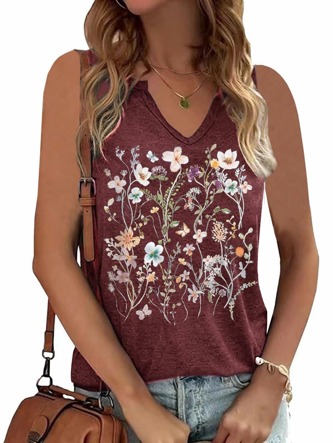 YIUIERE Womens Floral V Neck Tank Top Maroon Size S