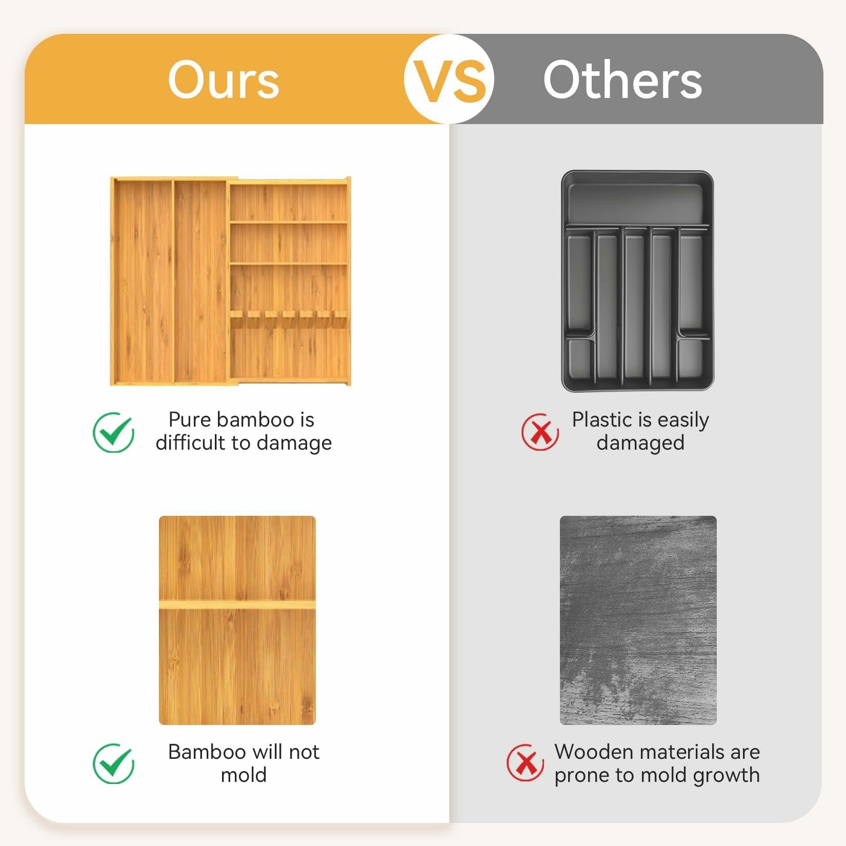 - 【Pure Natural Bamboo Utensil Drawer Organizer】: Our kitchen drawer organizer is made of naturally regenerated bamboo, and the entire silverware drawer organizer is made of pure bamboo material. Bamboo material is not as easily damaged as plastic silverware drawer organizer, nor as moldy as wooden cutlery boxes, making it the best helper in the kitchen