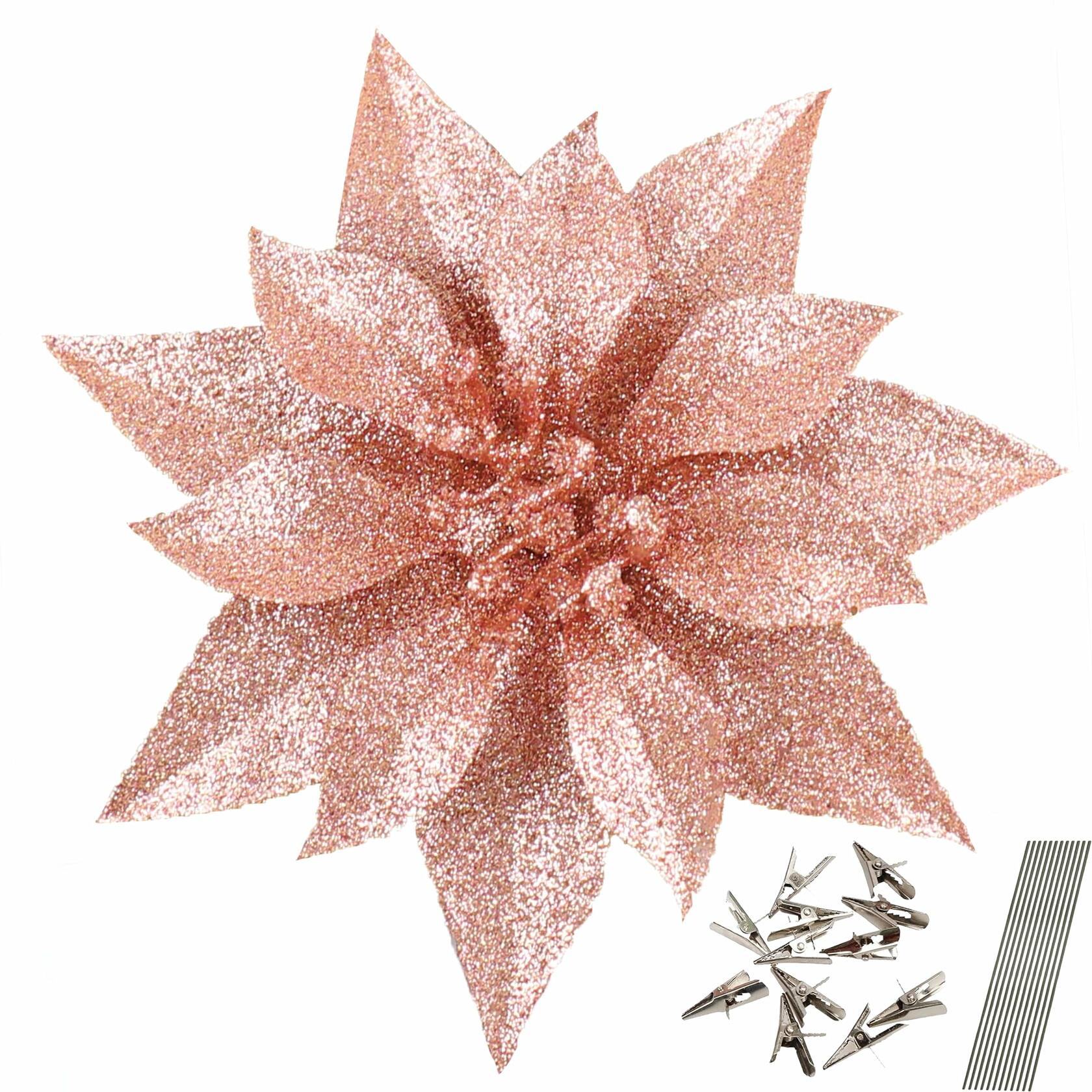 - EASY DECORATION:These champagne Christmas flowers for tree comes with clips and stems that allow you to attach them to your Christmas tree effortlessly.Just insert the clip or stem tip into the root of the champagne poinsettia flowers then apply them on anywhere you like.Sparkling in the winter,these champagne christmas ornaments will add an elegant& warm touch to your holiday decor and enhance the festive atmosphere.