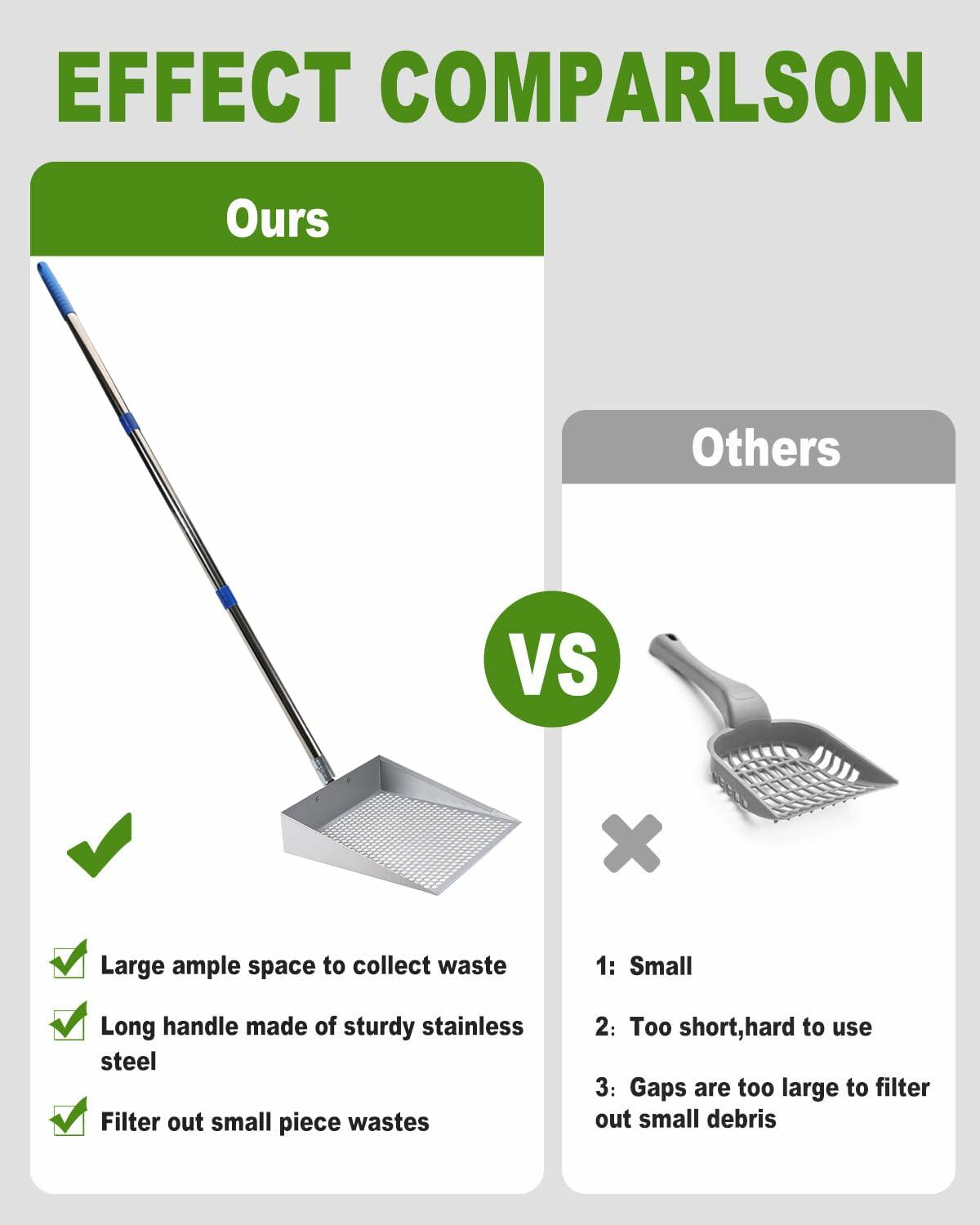 - 【Extended Handle for Ease of Use】 Equipped with a 44.5in long handle made of sturdy stainless steel, this litter scooper allows you to clean the chicken coop without the need to bend over excessively. This design reduces strain on your back, ensuring comfort during use and making it one of the most practical chicken coop cleaning tools.