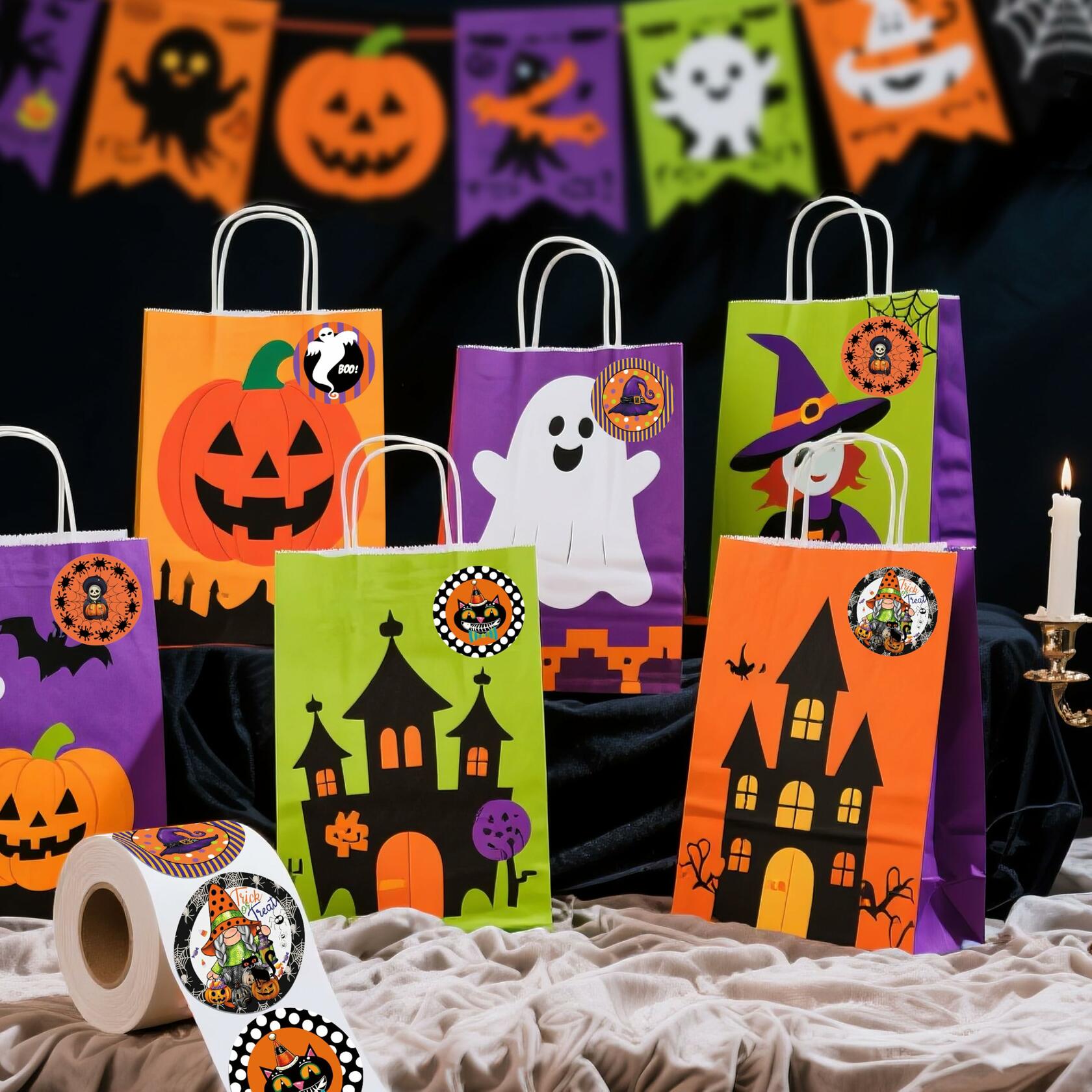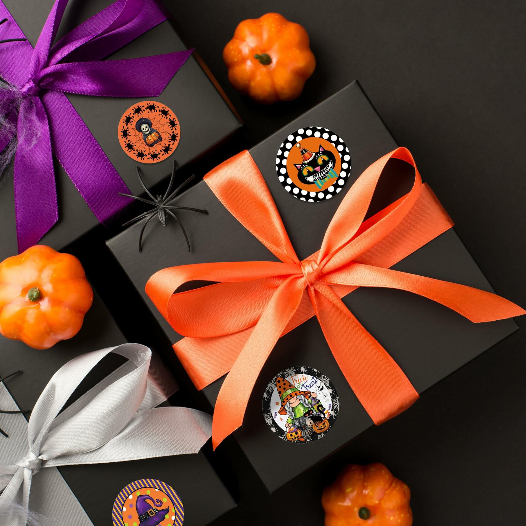 ZAEW Halloween Sticker Roll 500pcs 1.5" Gnome Pumpkins Cats Ghost Colored