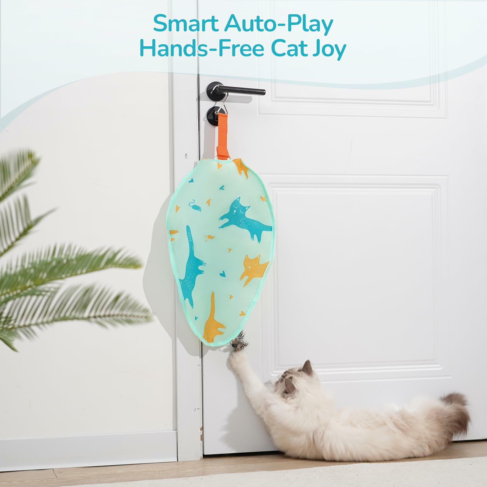 The Zenjo interactive cat toy Hang this indoor cat interactive toy on a door frame or door handle. The movable feather quickly rises or falls inside the cloth cover, constantly appearing and disappearing, which stimulates cats' hunting instincts and invites them to join the search, hiding and chasing games.