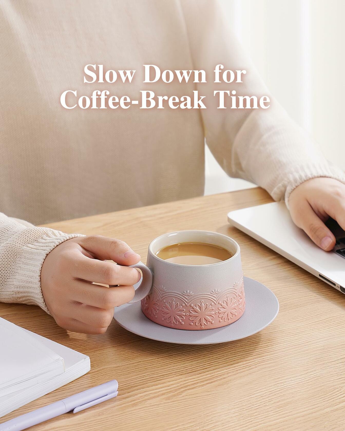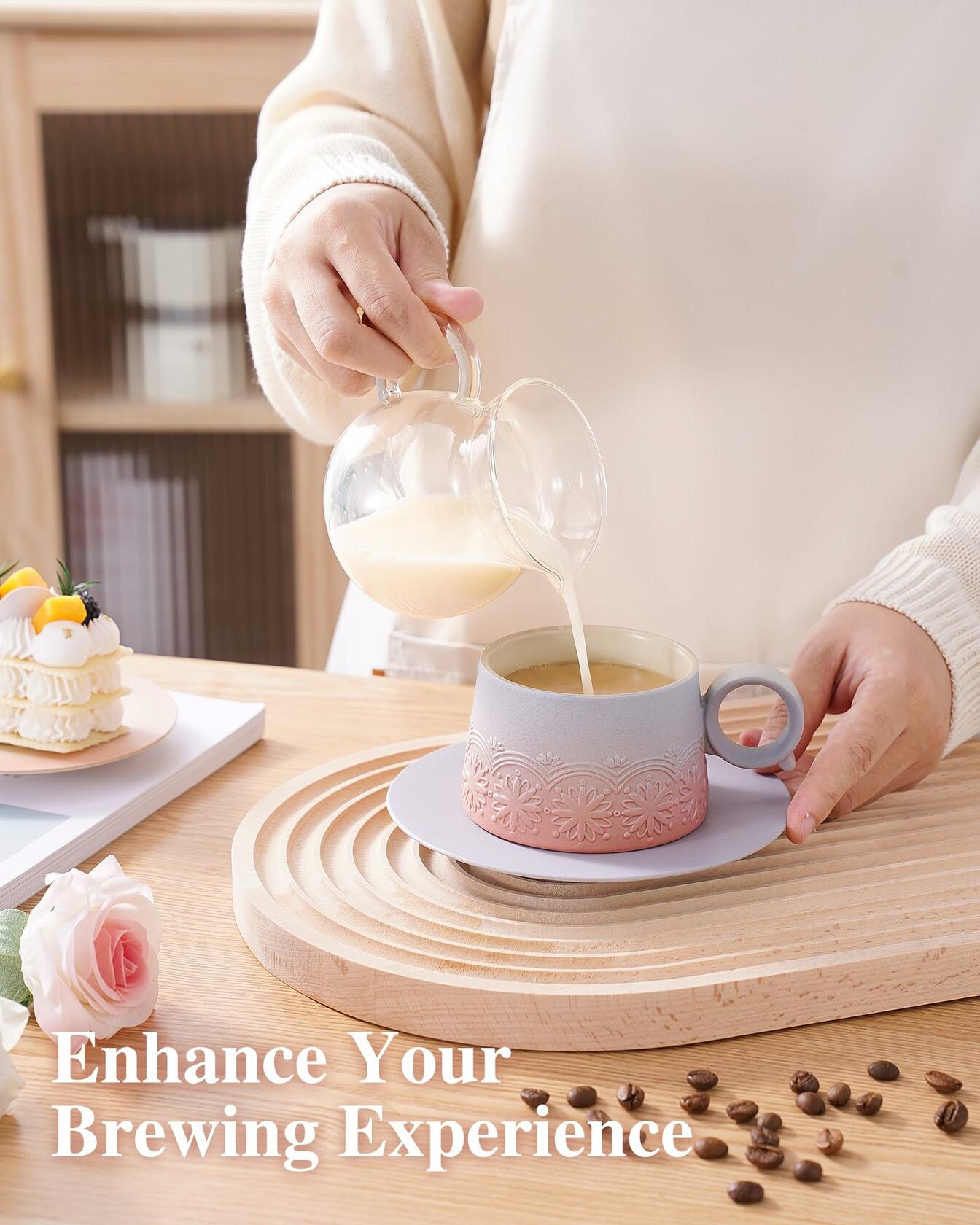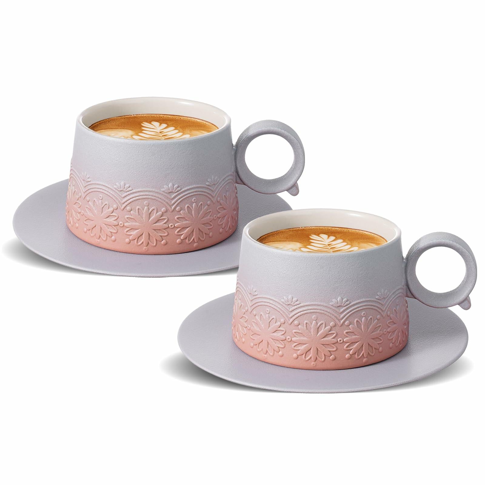 - ELEGANT DESIGN LATTE ART MUG WITH SAUCER: Zens cappuccino cup is designed by professional artists, The eye-catching gradient grey pink glaze with artistic embossed sunflower pattern that resembles nature's beauty paintings. they are a blend of art and aesthetic, adds a modern touch to your coffee table and bringing delightful enjoyment to your coffee break. Truly fantastic latte art cup for Baristas Gifts.