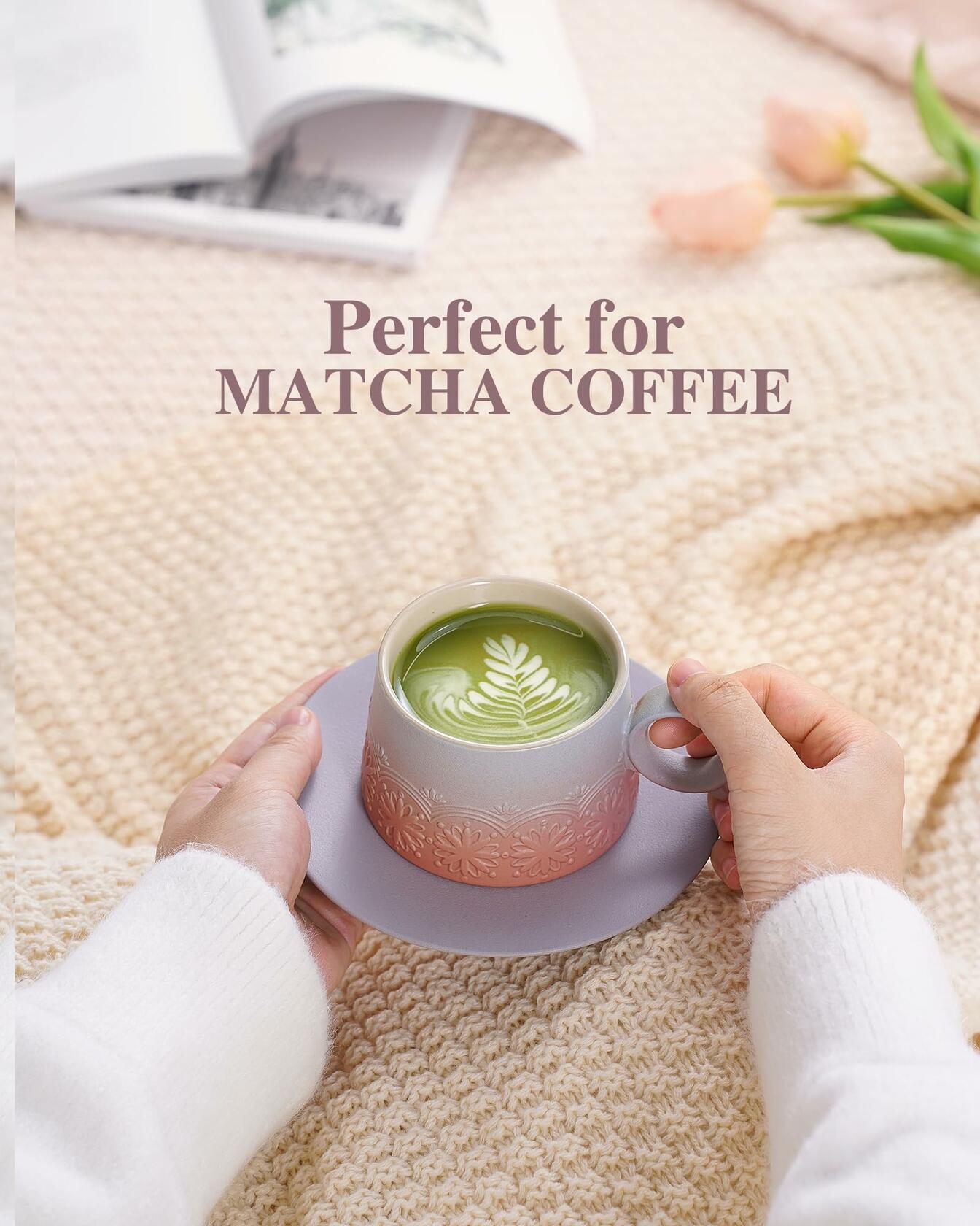 - HIGH QUALITY STURDY CERAMIC: Made of pro-grade heavy ceramic clay, fired at high temperatures to ensuring long-lasting durability. It is lead free which means you can enjoy your coffee basis without worrying about harmful substances leaching into it. the latte cups with saucer is microwave and dishwasher safe, and no any stains or residue left behind with on the glossy interior after washing.