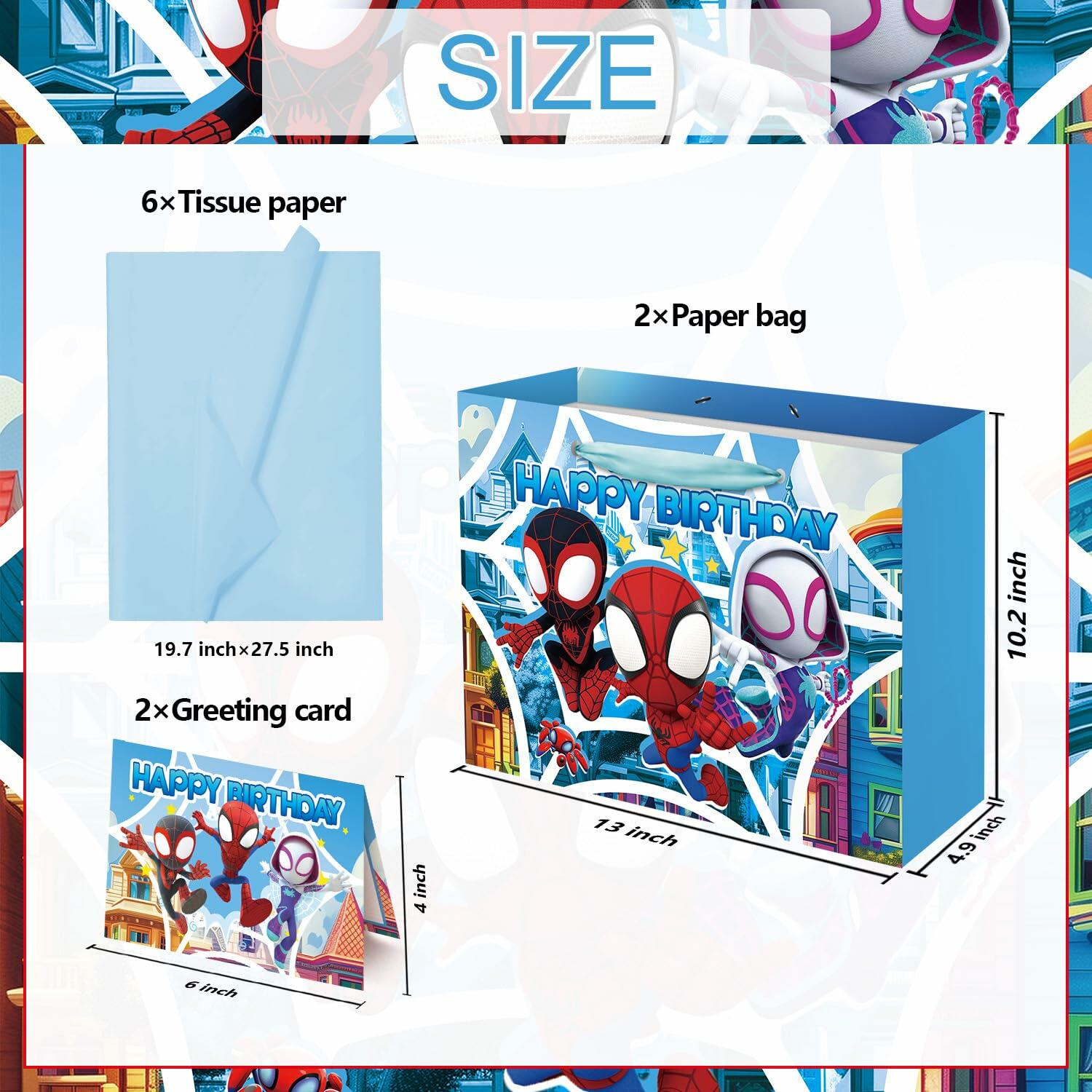 - Package Contents: The package includes 2 spidey paper bag with handles, 6 blue tissue papers and 3 greeting card, all of which are enough to meet different wrapping requirements of the birthday party.