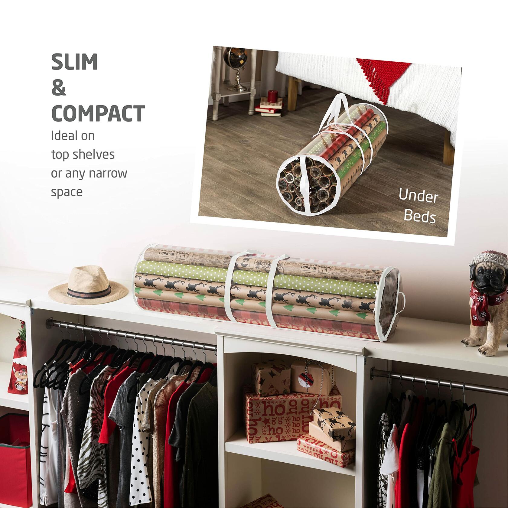 - PROTECTION FROM THE ELEMENTS - Wrapped in breathable fabric and zipper closure, this gift wrap organizer ensures your rolls are safe from any moisture or mold. Maintain the pristine condition of your gift wrap and ribbons, preserving their festive charm for years to come.