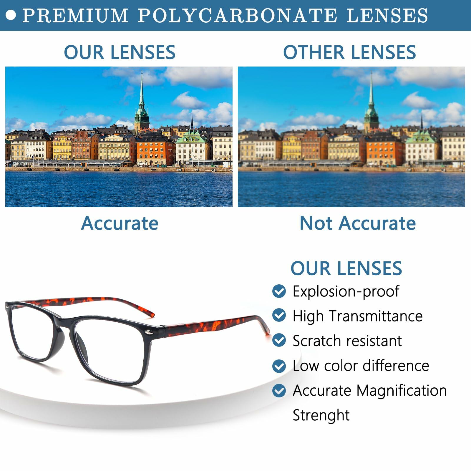 - Quality Reading Glasses - Our reading glasses use high quality polycarbonate lenses, high light transmittance, thin lenses and not easy to scratch, both beautiful and practical. The lens provides accurate magnification strength, ensuring you a clear view.